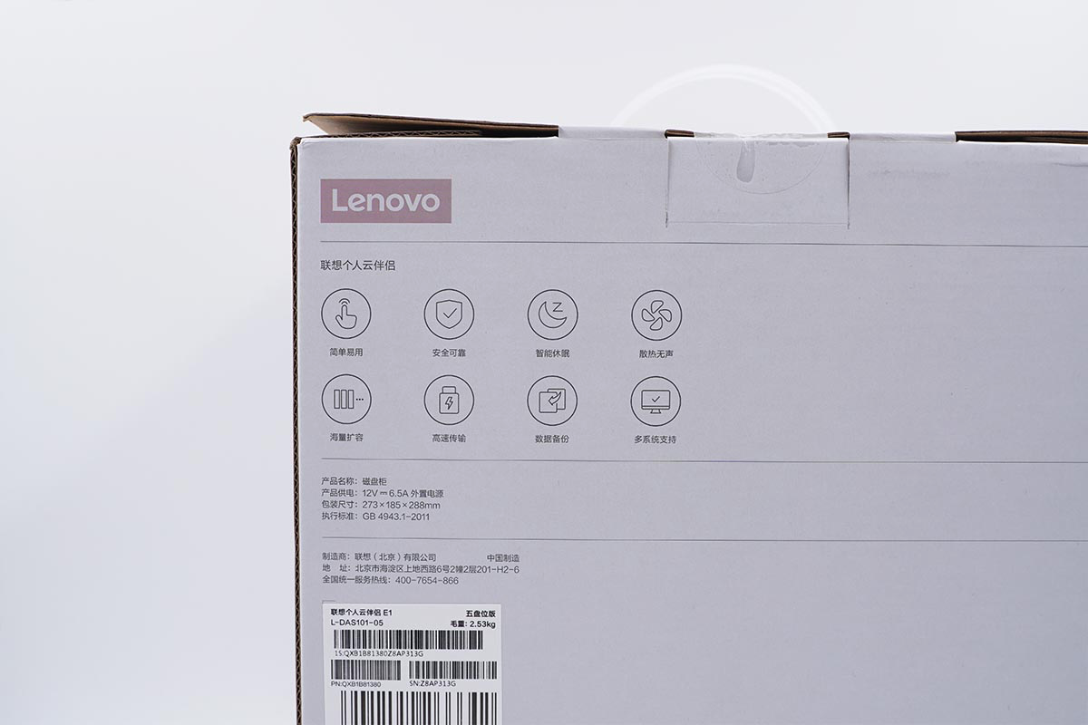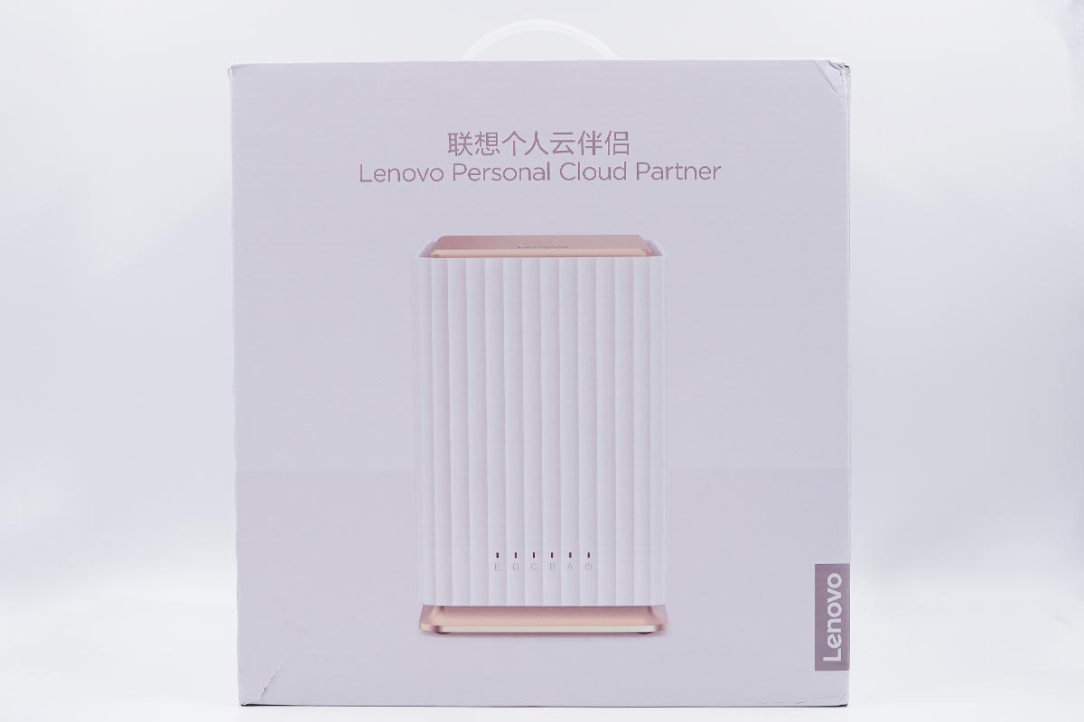 相较于硬盘盒或硬盘底座来说,这款磁盘柜的包装盒有点大,包装盒的正面是这款产品的名称:联想个人云伴侣,正面能看到产品的正面照。