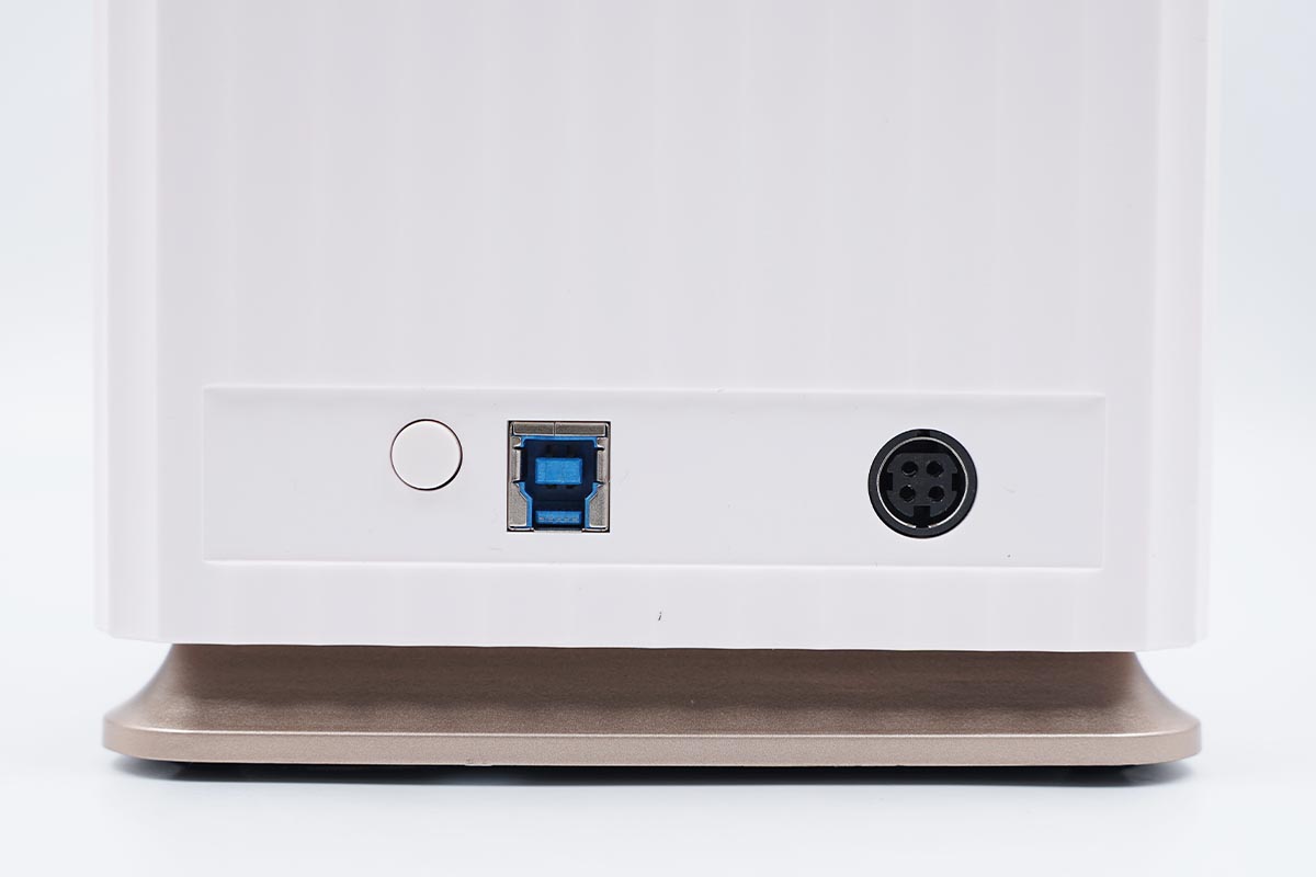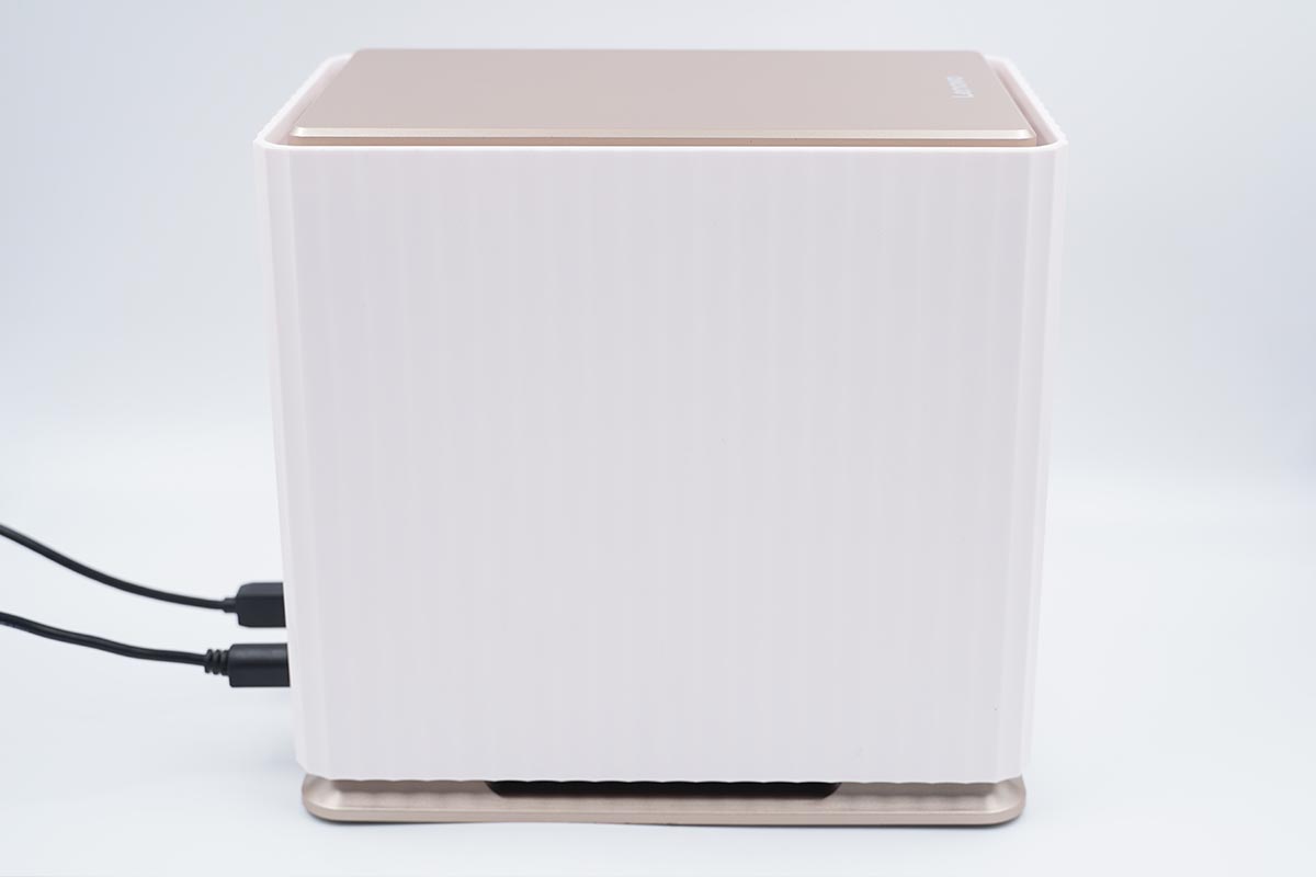 联想的这款磁盘柜整体造型较为方正,产品机身采用樱花白,顶部盖子和底部底座为曜石金配色。