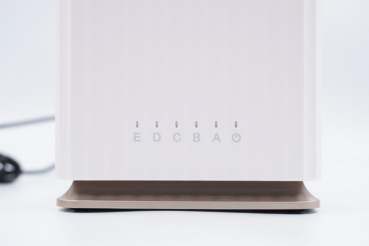 正面依次罗列着六个指示灯。其中最右侧的为电源指示灯,A-E为硬盘指示灯,小编拿到的这款为五磁盘位的磁盘柜。