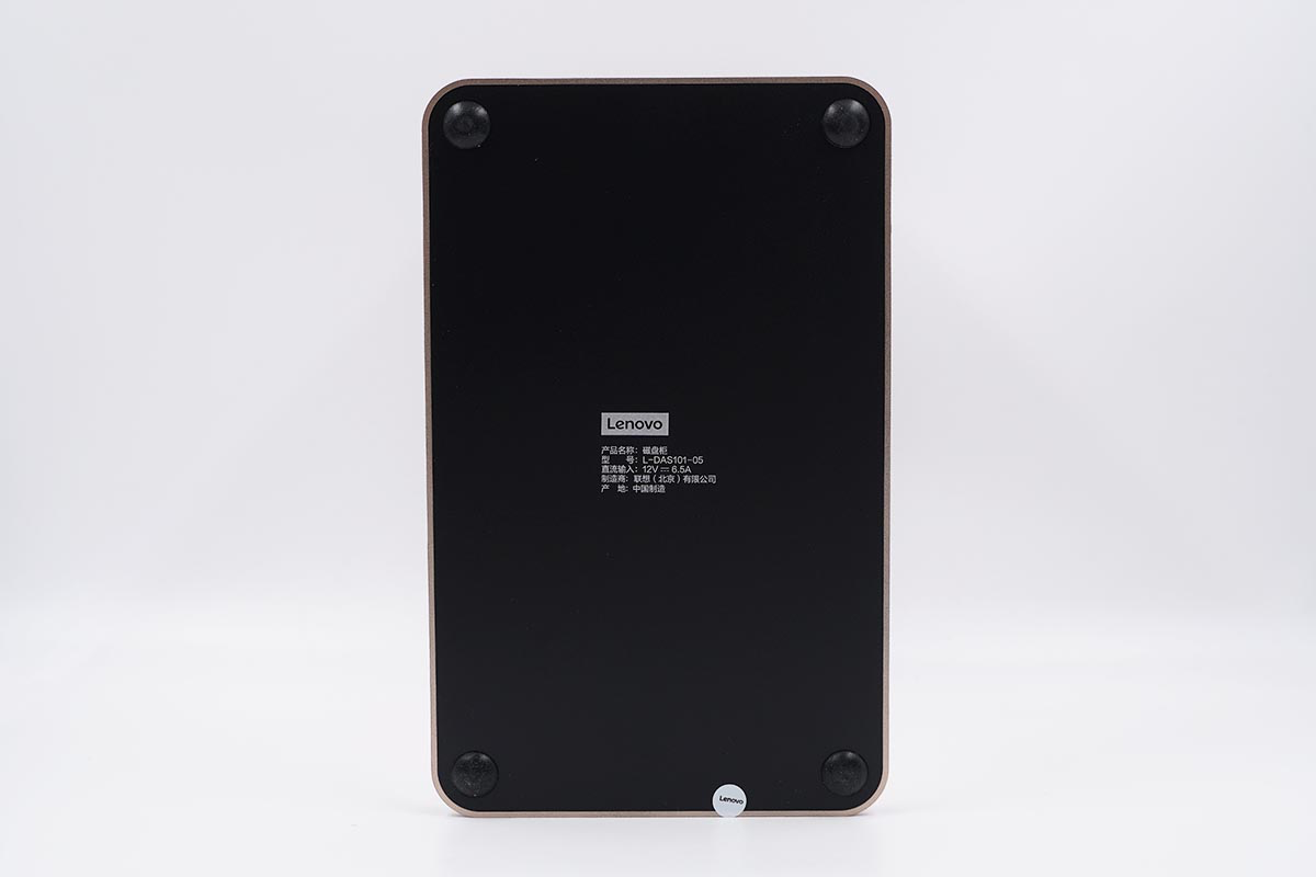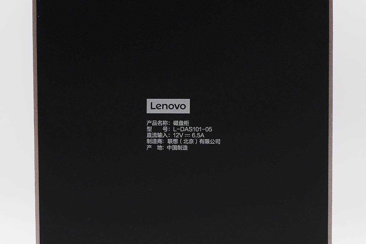 外观设计上联想的这款磁盘柜整体造型较为方正,产品的具体尺寸为22x13.5x21cm。上方为按压盖板,方便开合,下方为底座,同时在上下两侧均带有散热孔位利于散热,同时在磁盘柜的底部还带有一个主动散热的风扇,有利于进一步的导出热量。