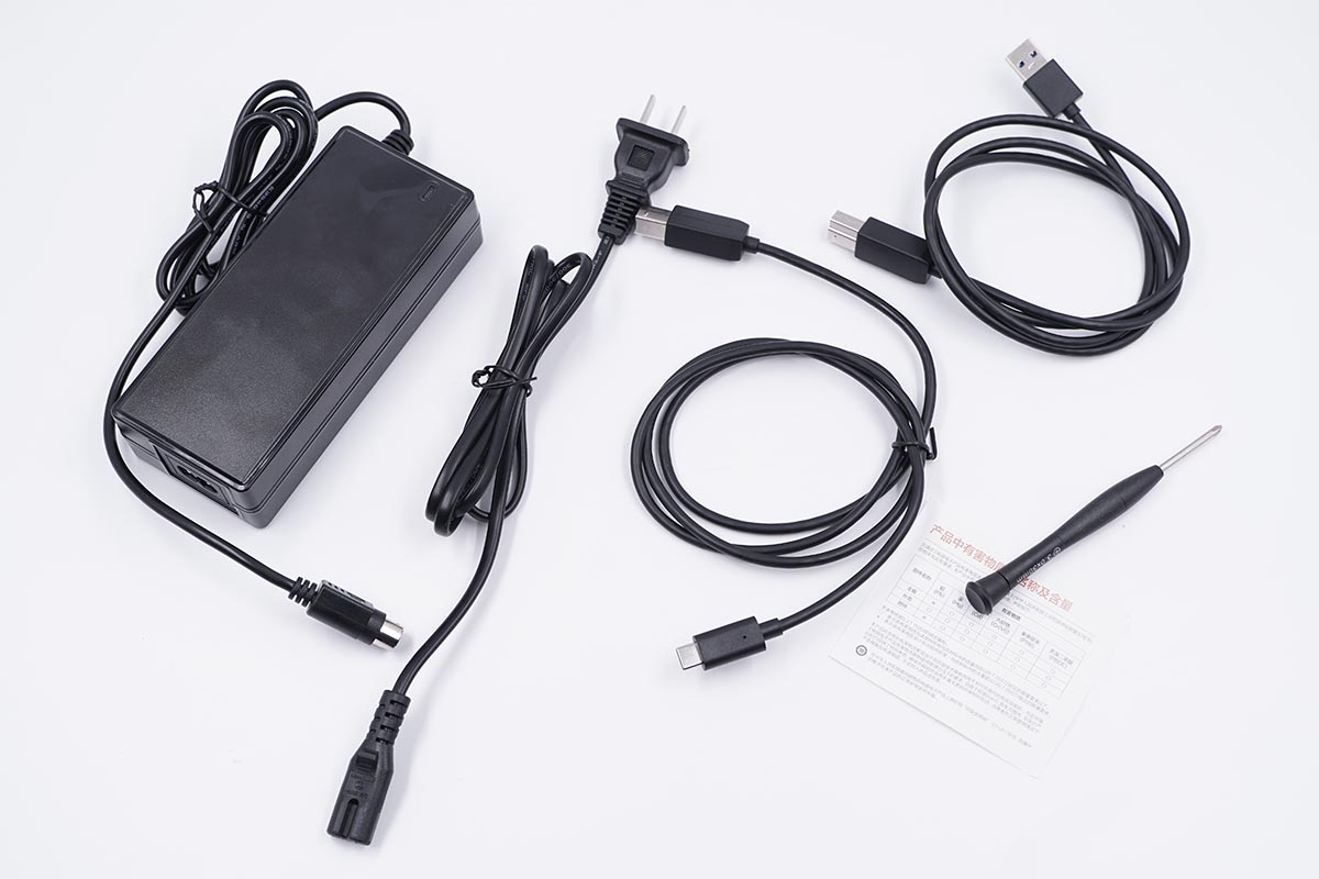 包装盒内附带了USB-A和USB-C两种接头的线材,这样电脑端无论是哪种类型的接口都可以直接连接使用,除此之外还标配了分离式的电源适配器以及固定螺丝以及螺丝刀。