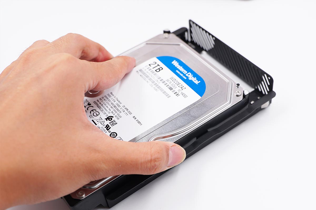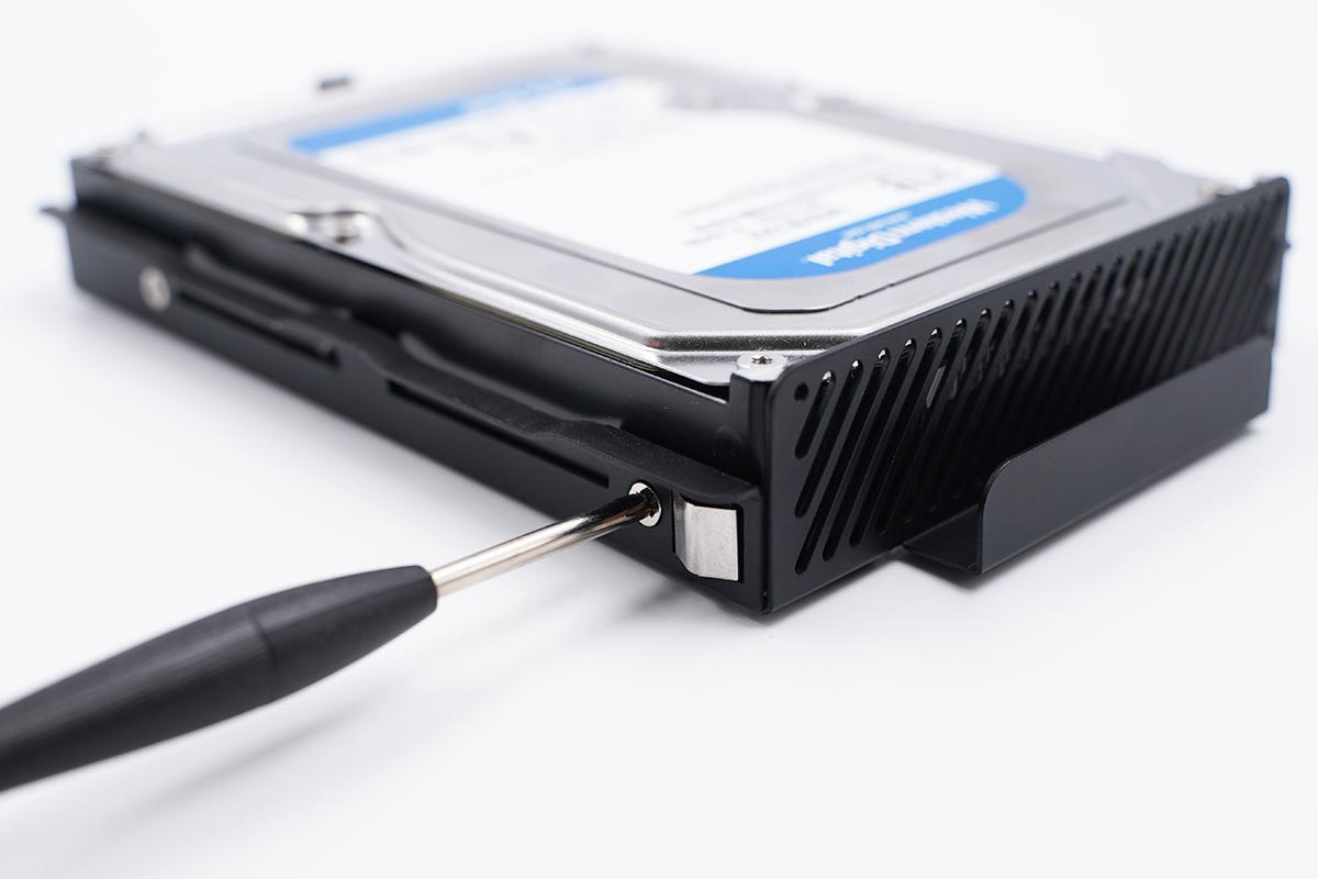 然后使用附带的螺丝刀和螺丝将硬盘固定在磁盘架上面。