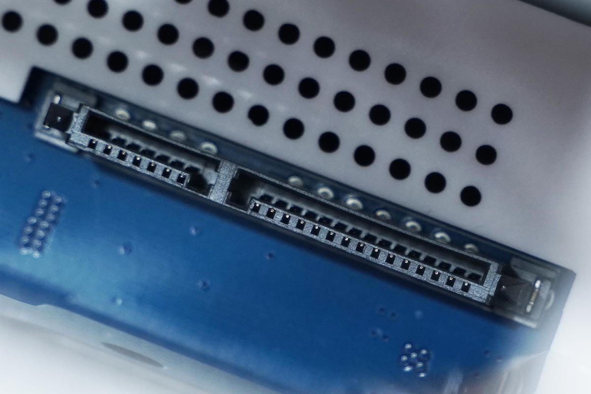 磁盘柜内部的接口特写,磁盘柜支持2.5英寸和3.5英寸的SATA接口的硬盘,且接口类型仅支持串口,这一点需要特别注意!