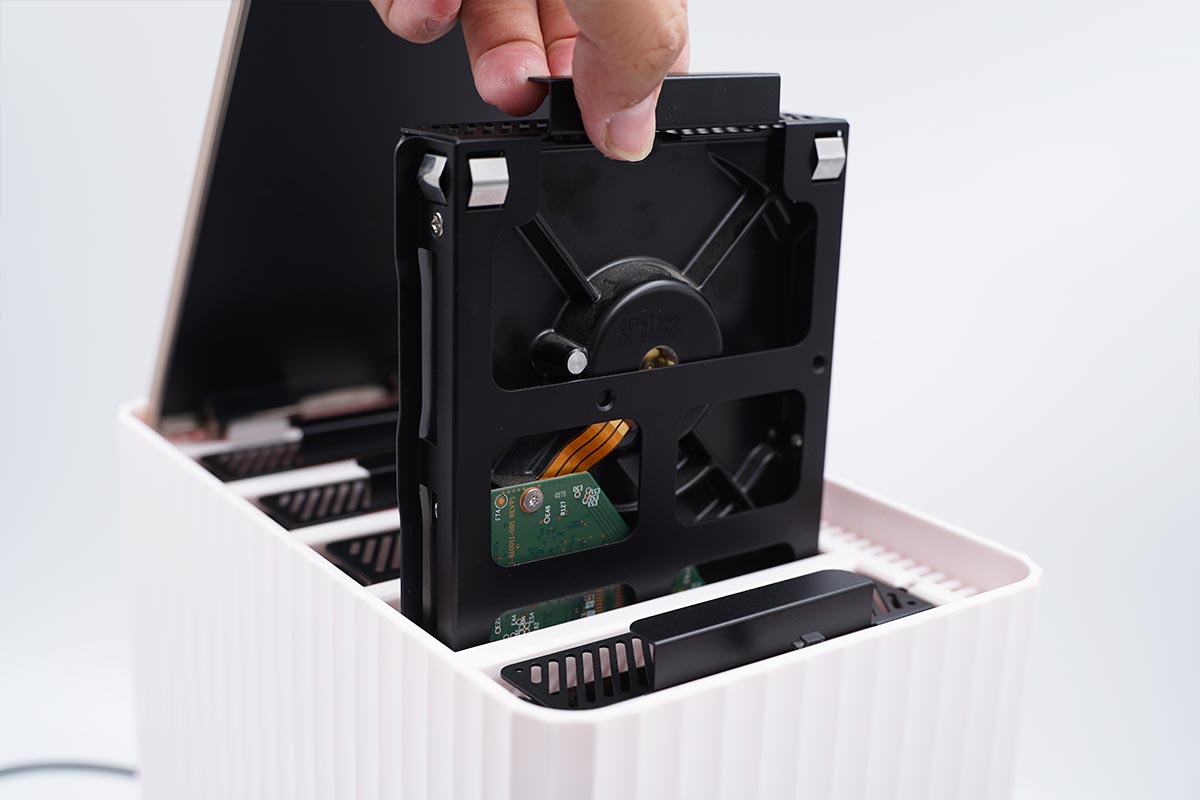 打开顶盖,内部依次罗列着五个磁盘位,每个磁盘位上面留有提手方便提取磁盘托架。