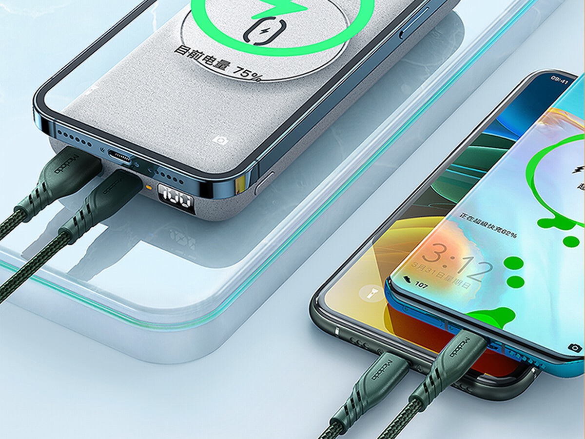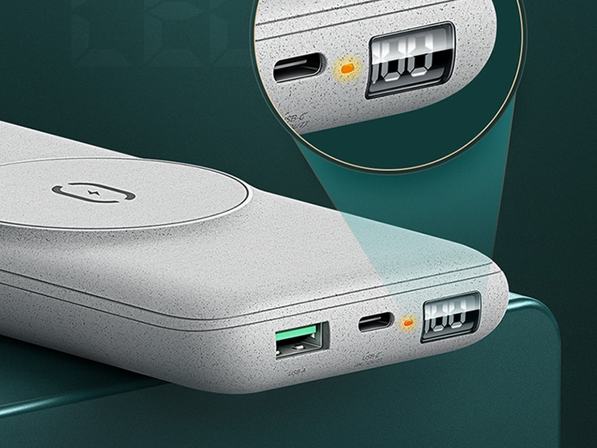 麦多多磁吸无线充电宝带有1A1C两个有线充电接口,USB-A输出口,支持5V3A / 5V4.5A / 9V2A / 12V1.5A四档输出,最大功率22.5W,支持SCP、QC等常见快充协议。USB-C双向快充接口,最大输出功率20W,支持iPhone 12 PD快充。集成LED数显屏,实时查看剩余电量情况,一目了然。并带有一个橙色多功能指示灯,呼吸闪烁为7.5W / 10W / 15W无线充电状态,长亮为5W或待机状态,橙红交替闪烁为异物检测保护状态。