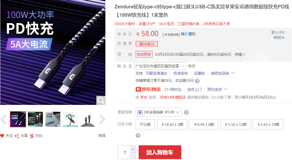 还有一条线材是100W C2C 快充线,5A大电流,三层纤维,2年质保只换不修。