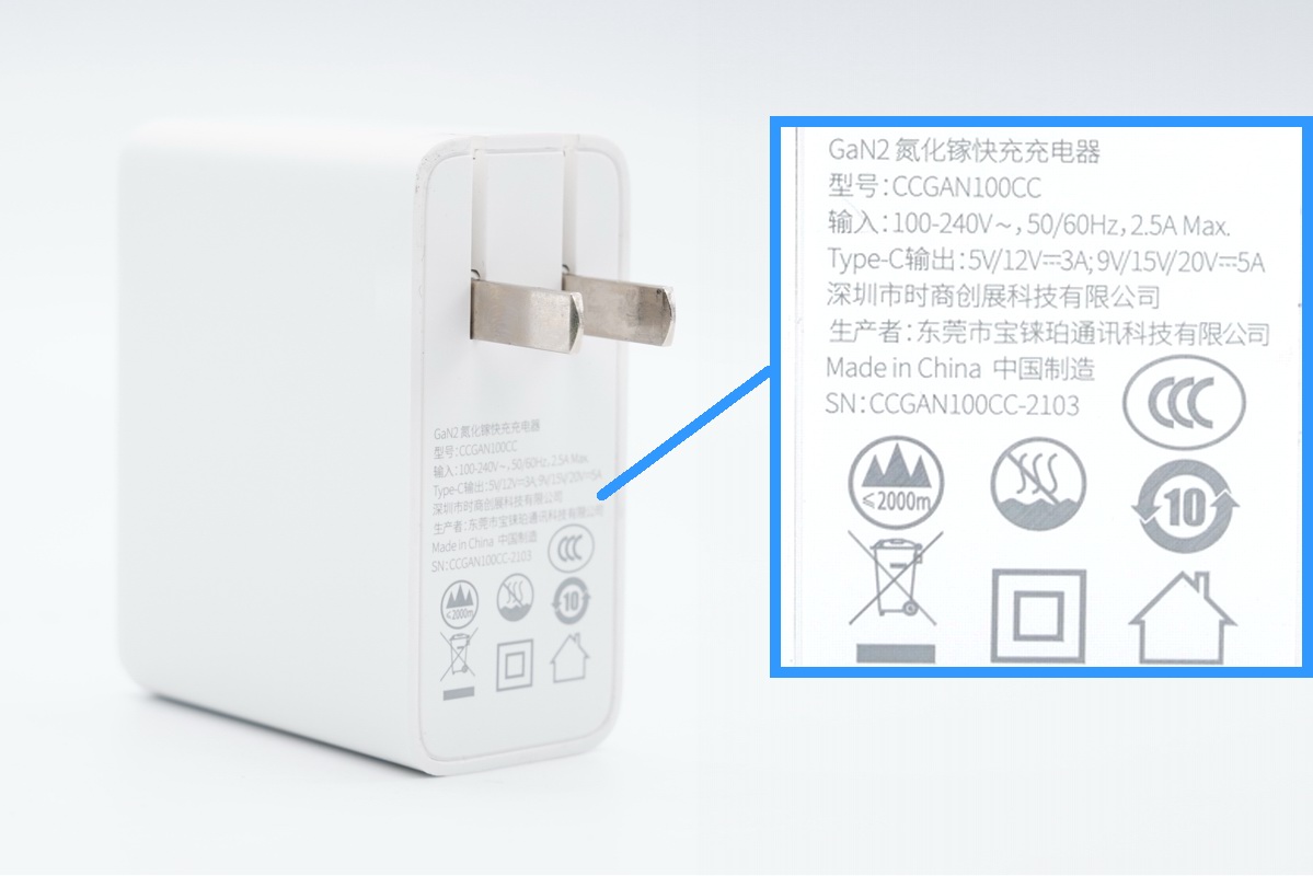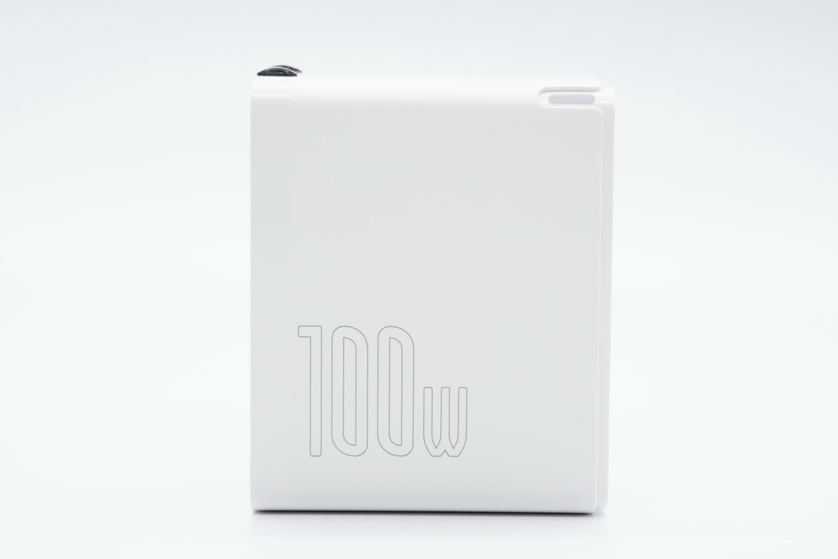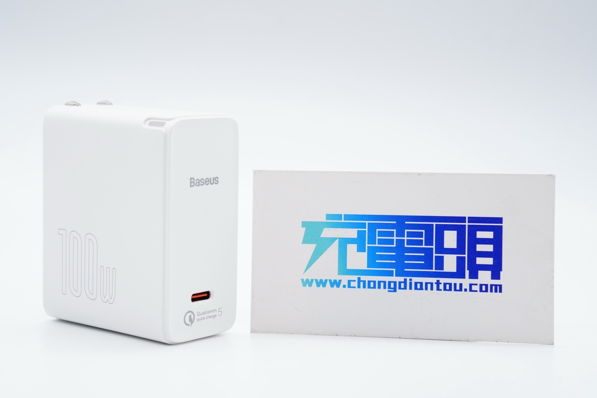 倍思100W QC5充电器侧面印有100W字样,特殊字体沿用倍思家族ID设计,可折叠插脚设计,方便收纳。内部采用高频高效的氮化镓功率器件制作,官方标注三围尺寸分别是67mm X 30mm X 55mm,按照100W额定输出功率计算,功率密度达到0.9W/cm³,重量仅为178g,比苹果96W充电器个头小还轻。