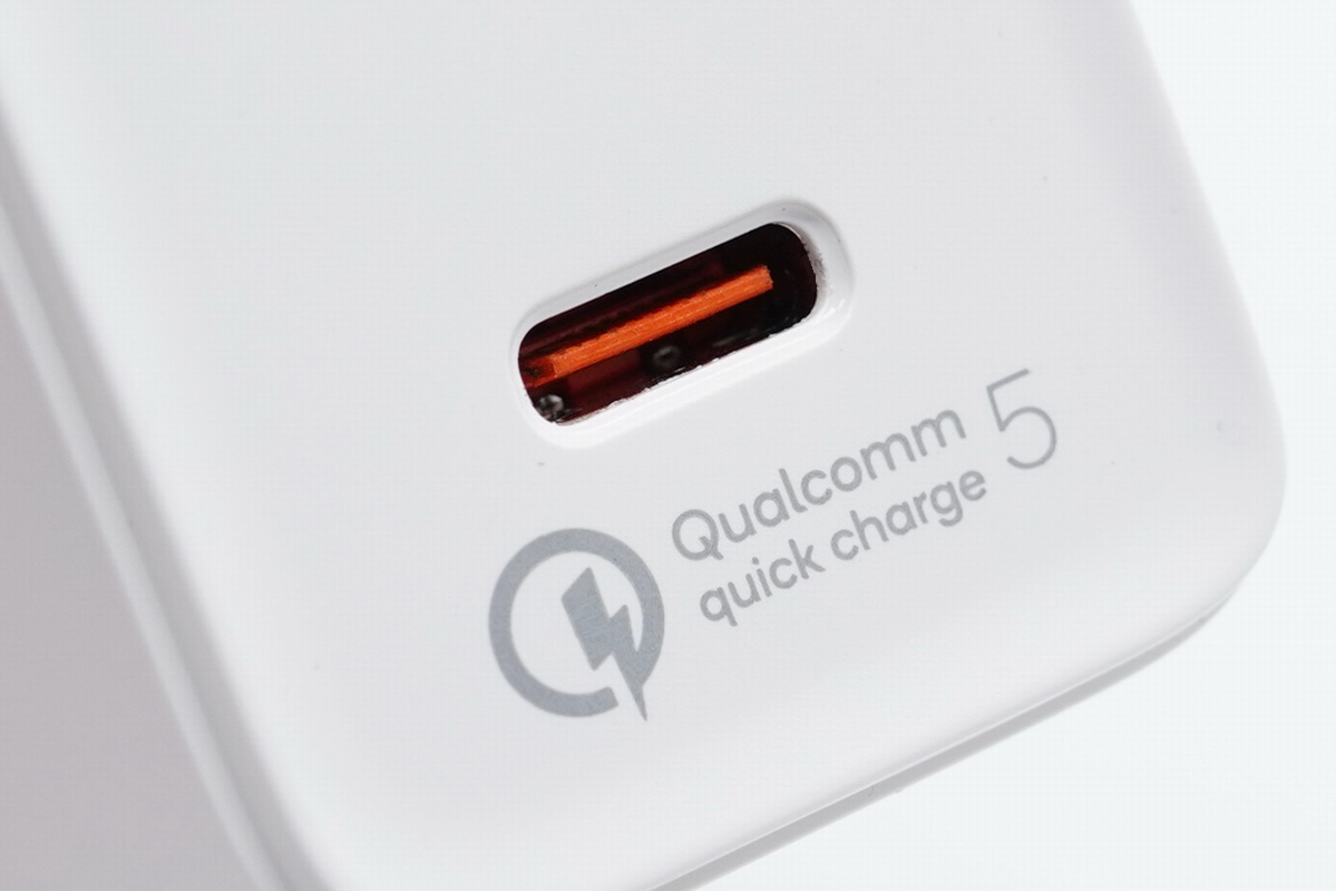 输出接口放置在下侧,为单USB-C输出口配置,橘色USB-C舌片母座十分醒目,在接口下面印有“Qualcomm Quick Charge 5”标志,表示该充电器通过了高通Qualcomm Quick Charge 5(QC5)认证。