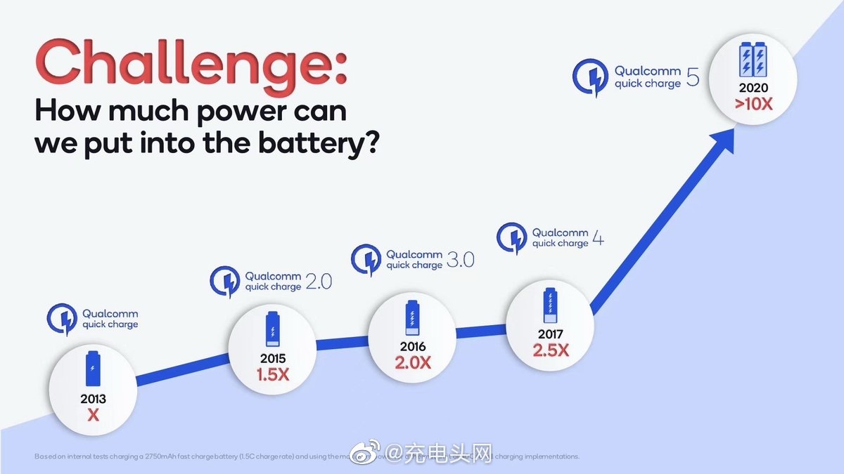 自2013年高通就开发出Quick Charge快速充电极速,之后经历了Quick Charge 2.0、3.0、4、4+,每一代充电功率都小幅度提升,2020年7月27日高通发布了新一代QC5快速充电标准,是世界上第一个智能手机100W+通用标准充电方案。QC5相比起上一代QC4,效率足足高出70%,充电速度提升4倍,并且发热温升降低10度,让碎片化充电体验获得飞跃式改善,改变智能手机用户的使用习惯。