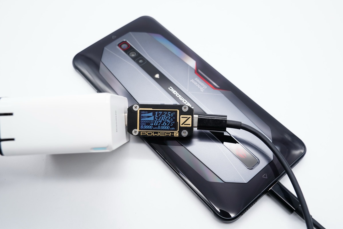 使用倍思QC5氮化镓充电器对支持QC5快充的红魔6 Pro手机充电,从POWER-Z USB测试仪屏幕中可以看到,充电功率达到17.25V 5.08A 87.67W,可以握手QC5快速充电协议。