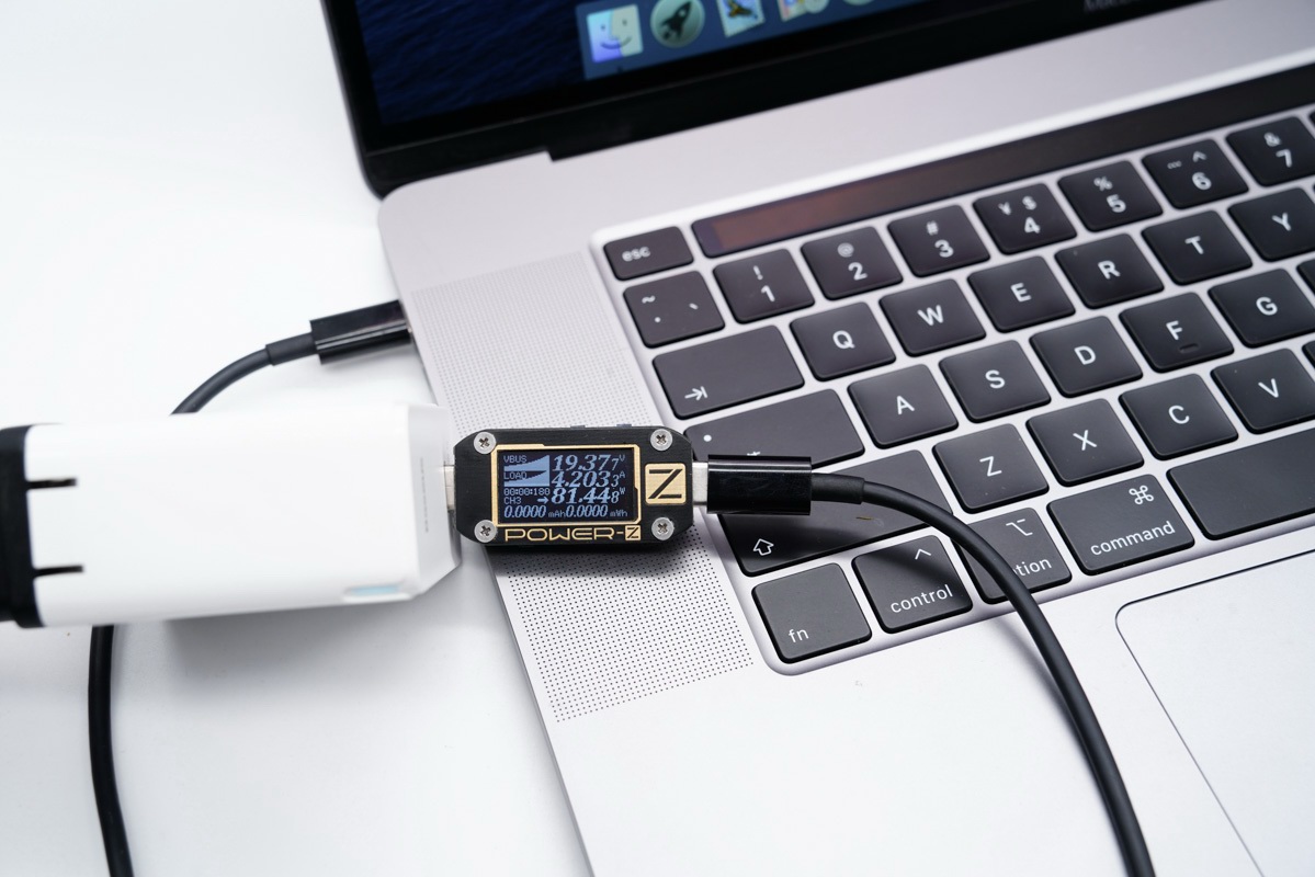 QC5快充协议兼容USB PD快速充电标准,可以对所有PD笔记本快充,实测对苹果Macbook Pro 16笔记本充电,功率达到19.37V 4.2A 81.44W,顺利握手PD快充。