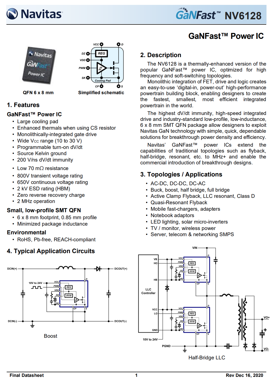 纳微NV6128可用于AC-DC开关电源,直流电压转换和逆变器应用,支持降压,升压,半桥和全桥拓扑,支持ACF拓扑,LLC准谐振及D类功放,支持准谐振反激拓扑。NV6128可用于快充适配器,笔记本适配器,LED照明,太阳能逆变器,电视机,无线充电,服务器,电信通讯及网络服务器的开关电源。
