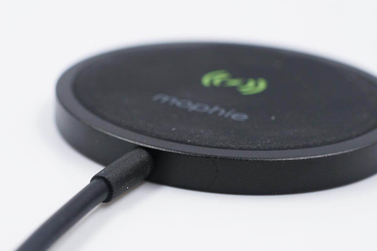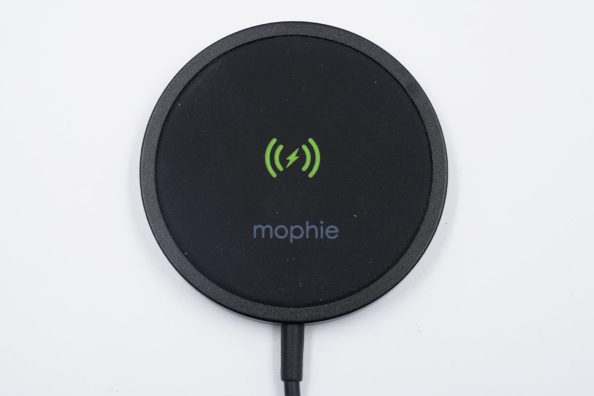 mophie磁吸无线充电器的充电面板整体外观为黑色,外圈为铝材质,内部无线充电区域使用硅胶填充,中间可以看到无线充电的标识和mophie的品牌Logo。