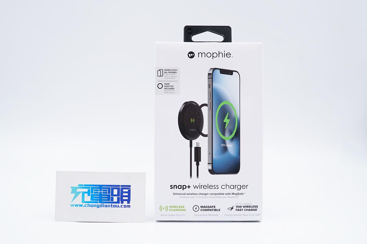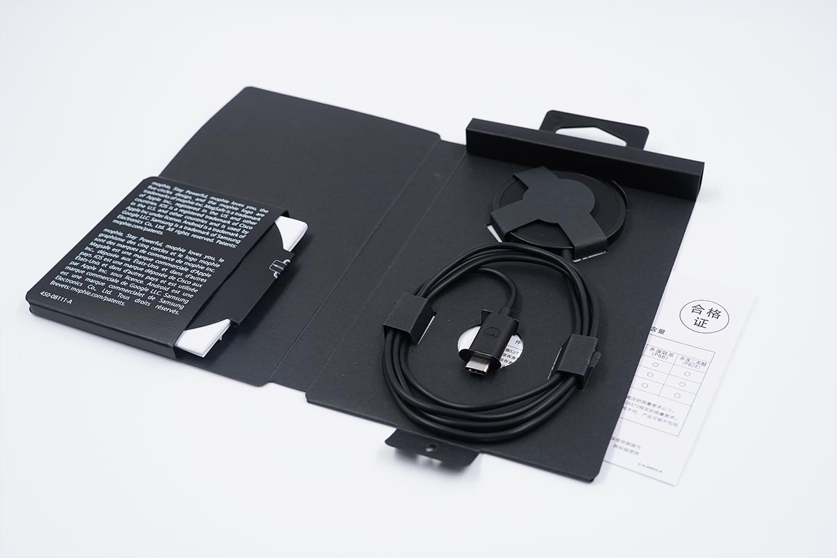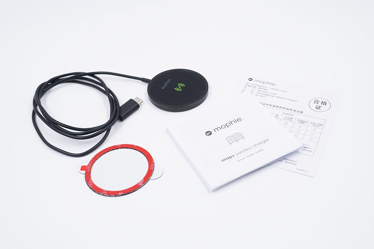 包装盒内的产品包括mophie磁吸无线充电器,磁铁以及纸质配件。
