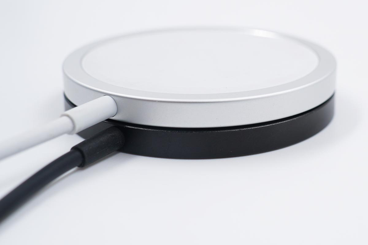 mophie的这款磁吸无线充电器在外观的设计上和苹果MagSafe无线充电器如出一辙,在配色上和苹果刚好相反。mophie磁吸无线充电器采用铝制外壳加上硅胶材质的无线充电面板设计,无线充电面板略高于四周铝制外壳可以防止划伤手机背板。