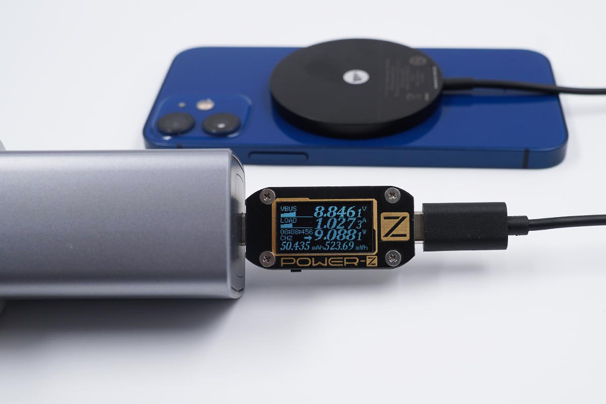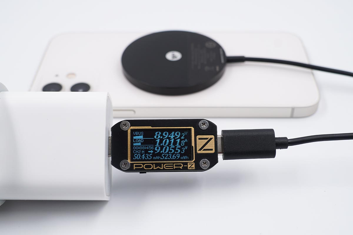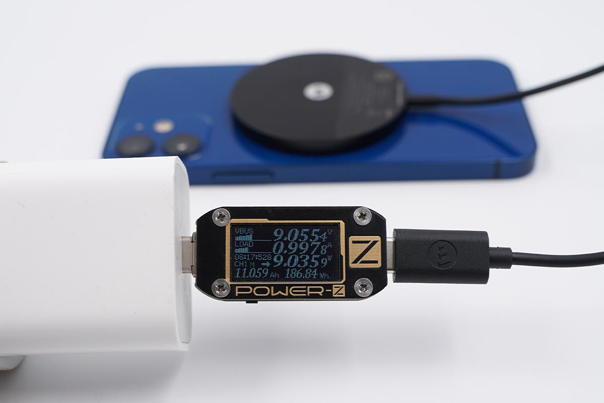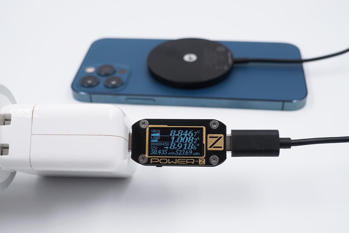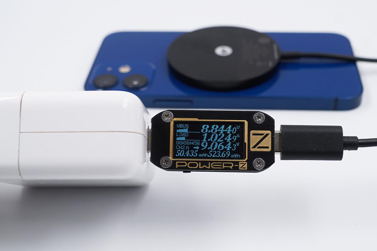使用努比亚65W氘锋氮化镓充电器搭配mophie MagSafe磁吸无线充电器为iPhone 12 mini充电,采集到输入端功率为9.08W。