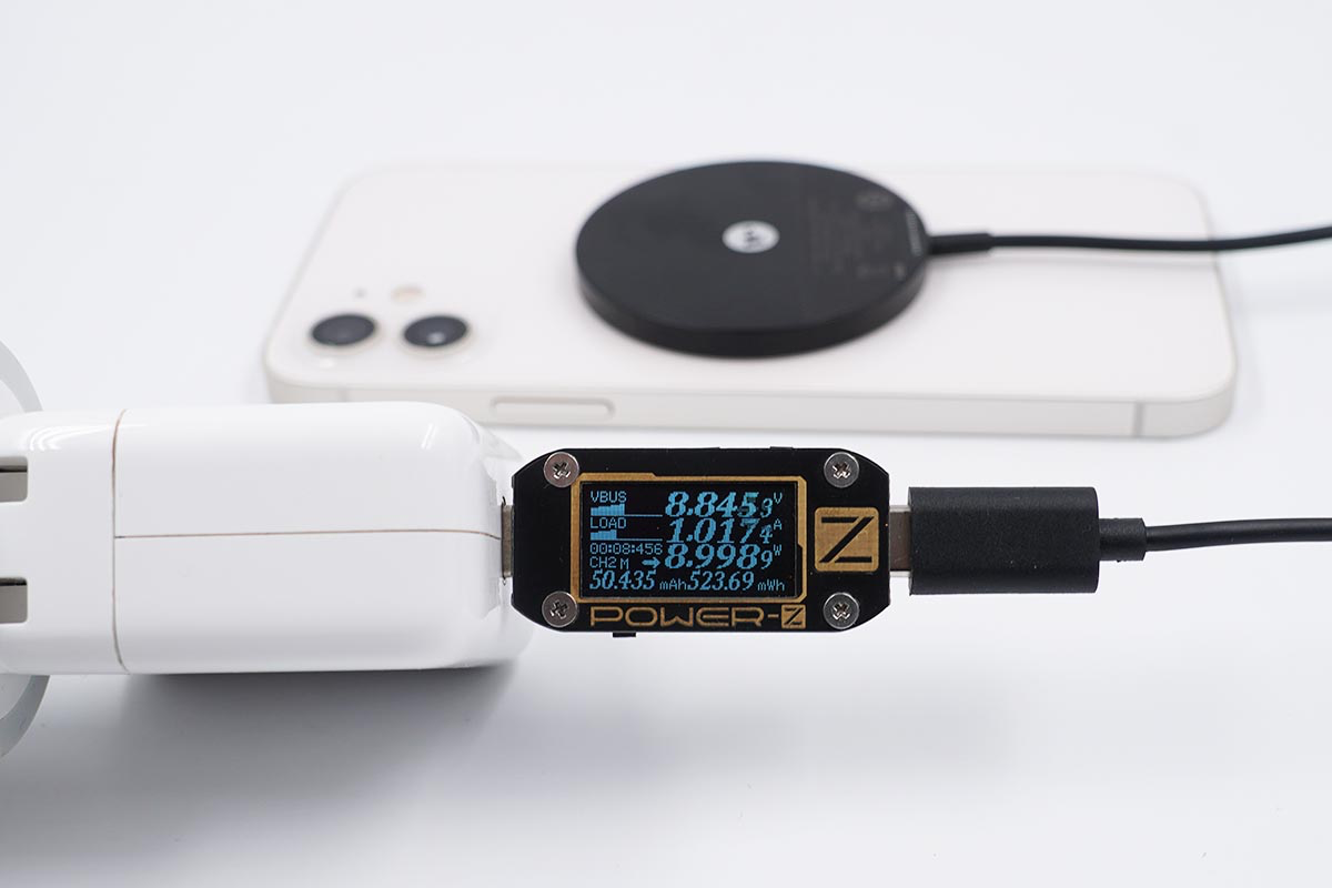 使用苹果30W充电器搭配mophie MagSafe磁吸无线充电器为iPhone 12充电,采集到输入端功率为8.99W。