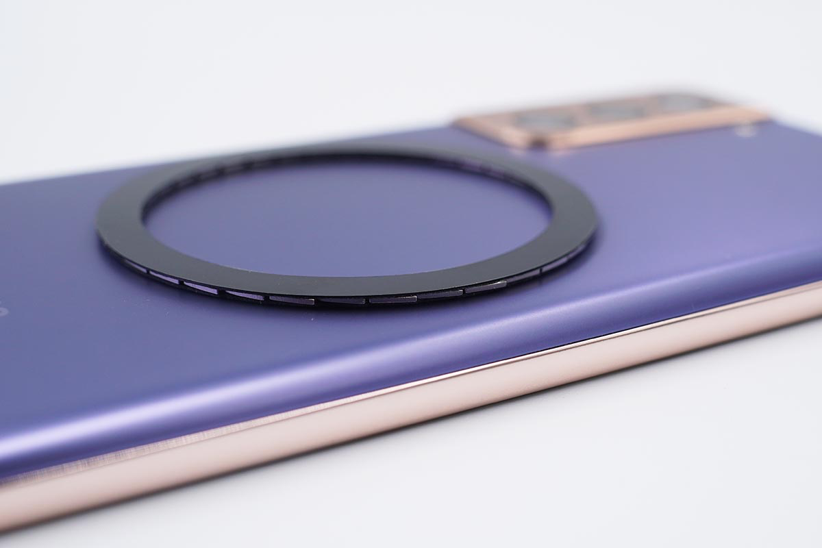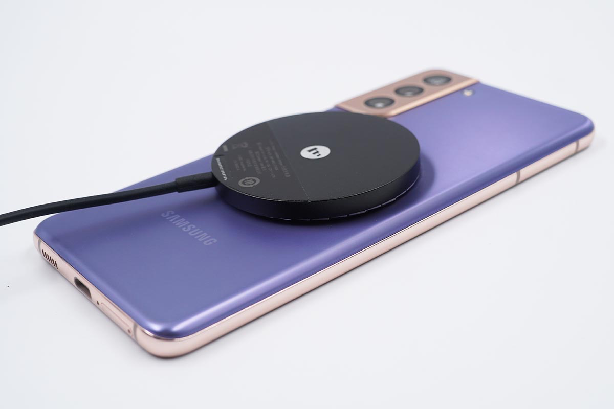 除此之外在苹果原装充电器的基础上还进行了创新,mophie在MagSafe磁吸无线充电器的基础上还附带了一个磁吸线圈,线圈自带粘胶可以粘贴在其他支持无线充电的手机上面,这样其他手机也可以使用mophie的MagSafe无线充电器了,解决了除iPhone 12外的其他智能手机无线充电对不准的问题。