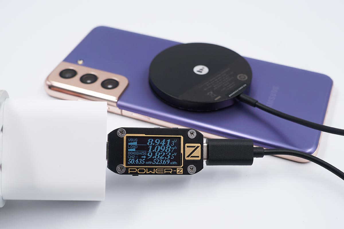 使用苹果20W充电器搭配mophie MagSafe磁吸无线充电器为三星S21充电,采集到输入端功率为9.82W。