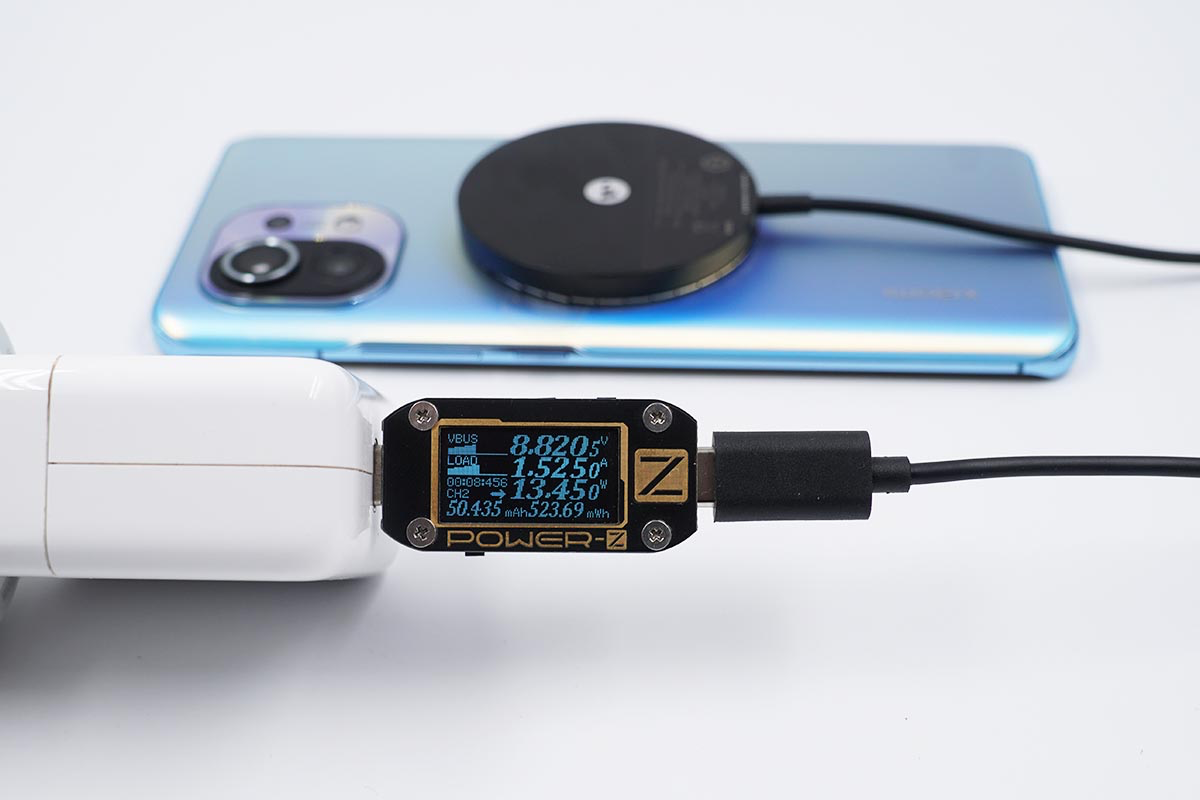 使用苹果30W充电器搭配mophie MagSafe磁吸无线充电器为小米11充电,采集到输入端功率为13.45W。