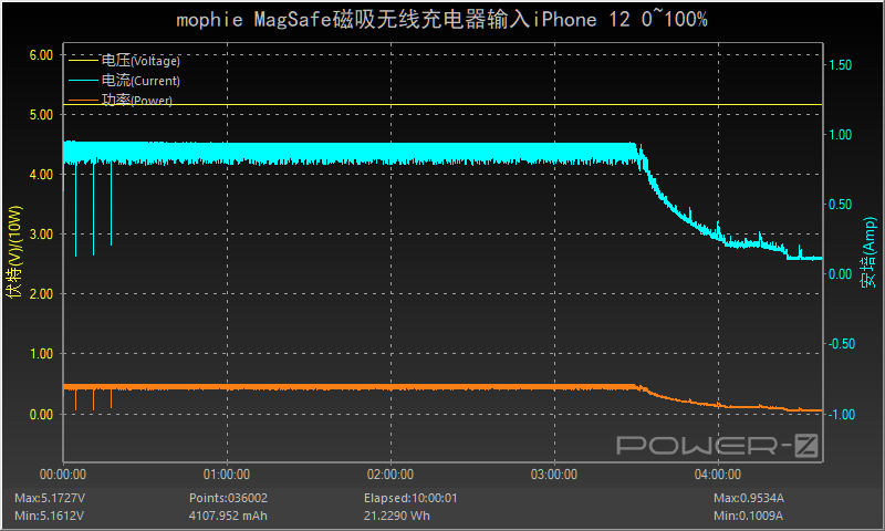 笔者使用苹果20W充电器搭配mophie MagSafe磁吸无线充电器为iPhone 12充电,功率持续以5W左右为iPhone 12充电,3小时30分后功率和电流逐渐下降直至充电结束,全程耗时约4小时24分,最高功率为5.16V 0.93A 4.84W。