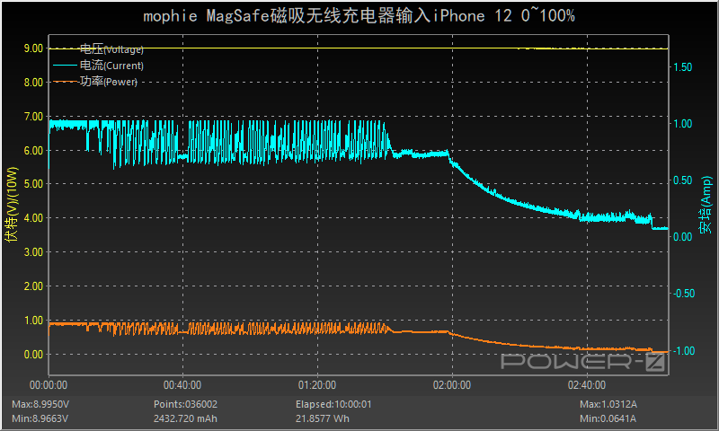 使用苹果20W充电器搭配mophie MagSafe磁吸无线充电器为iPhone 12 mini充电,采集到输入端功率为9.03W。