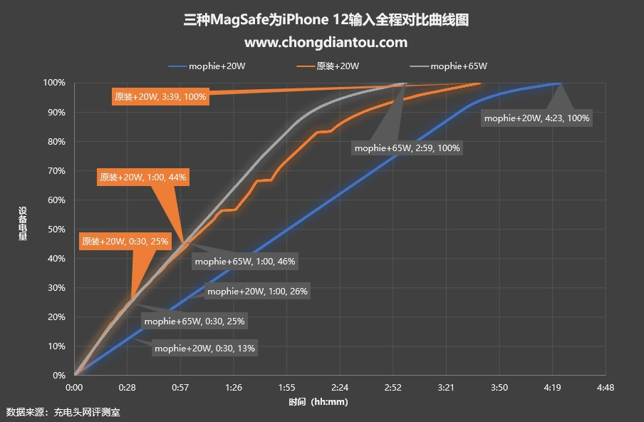 笔者将mophie 磁吸无线充电器搭配两款不同的充电器为iPhone 12充电加上苹果原装MagSafe充电器的测试数据加入了进来,可以看到三条曲线相差还是很明显的,整体上来看mophie搭配65W PD充电器的充电速度更快一些,完全充满需要2小时59分;而苹果原装完全充满需要3小时39分;最后是mophie磁吸无线充电器搭配苹果20W PD充电器速度最慢,需要4小时23分才能充满。
