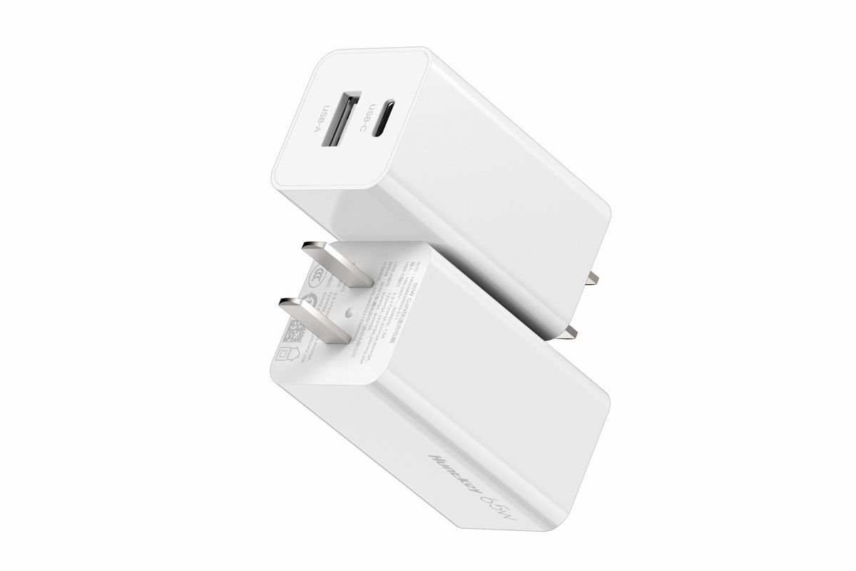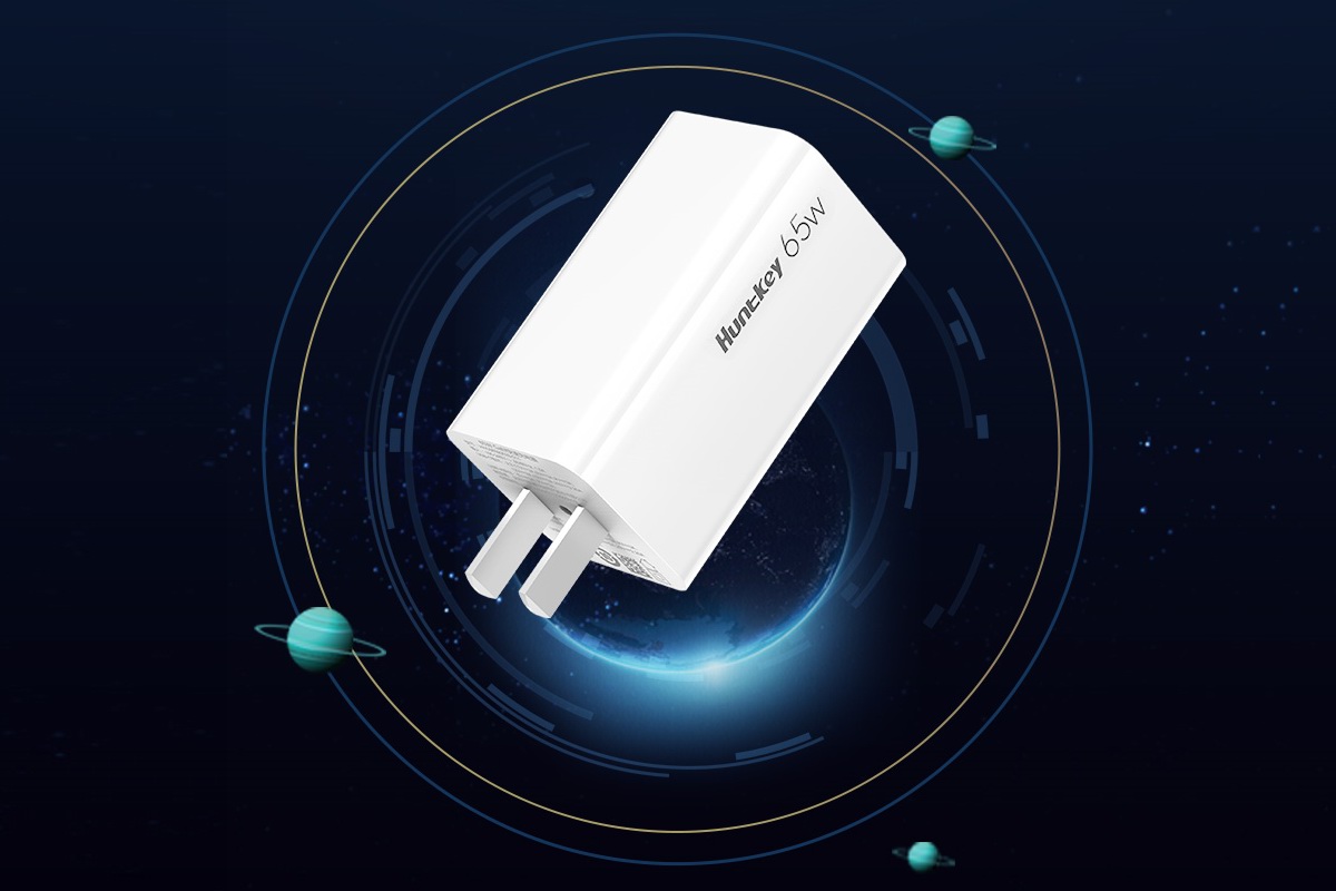 航嘉新品65W氮化镓充电器条形柱状外观设计,全白色的壳体表面采用磨砂与亮面两种工艺混搭,侧边印有“Huntkey 65W”商标与功率标识,代表这枚小巧的充电器拥有澎湃的输出能力,插脚方面是固定两脚插脚,进一步缩减体内空间。