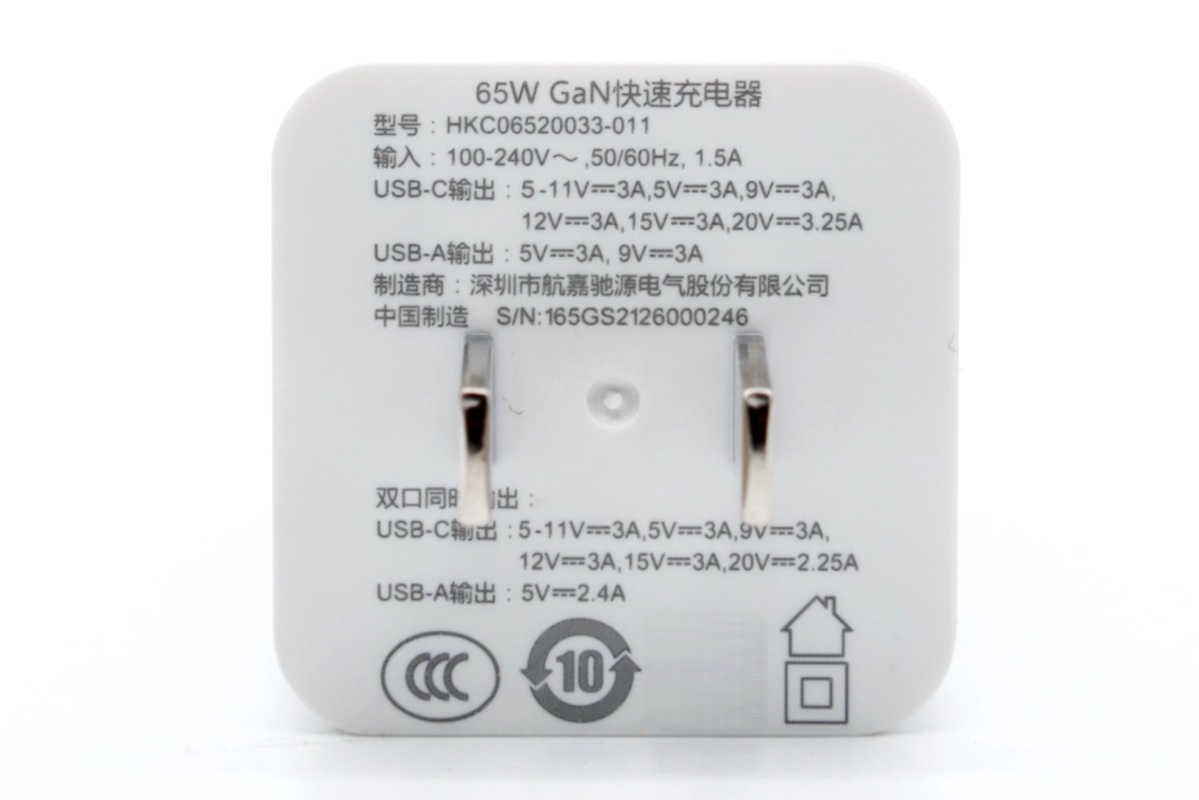 很多用户手上新老设备同时服役,并且多设备面对复杂的使用情况,单一接口规格的充电器无法很好地满足用户所有需求,航嘉新品65W氮化镓充电器提供了两个输出接口,1A1C万金油配置可适用新老设备与不同线缆使用。