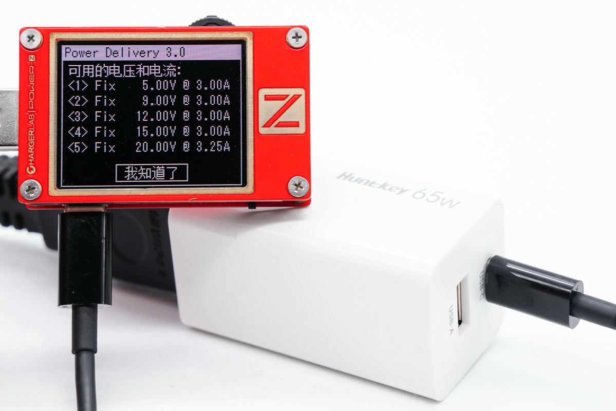 使用POWER-Z KT002 USB测试仪读取航嘉新品65W氮化镓充电器PDO报文,从屏幕中反馈信息可以看到,航嘉新品65W氮化镓充电器支持PD3.0快速充电标准,带有5V3A / 9V3A / 12V3A / 15V3A / 20V3.25A五个完整PDO电压档,最大输出功率65W。