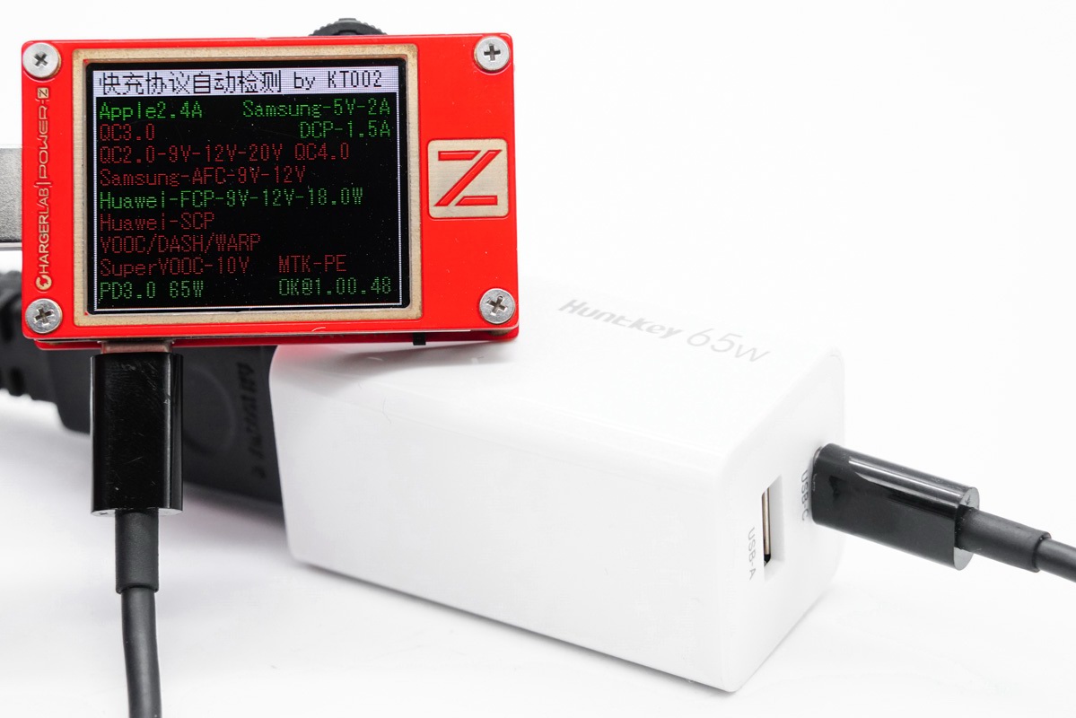 使用POWER-Z KT002 USB测试仪对航嘉新品65W氮化镓充电器进行快充协议轮询,USB-C与USB-A接口均带有APPLE2.4A、Samsung 5V2A、DCP、FCP快充协议。