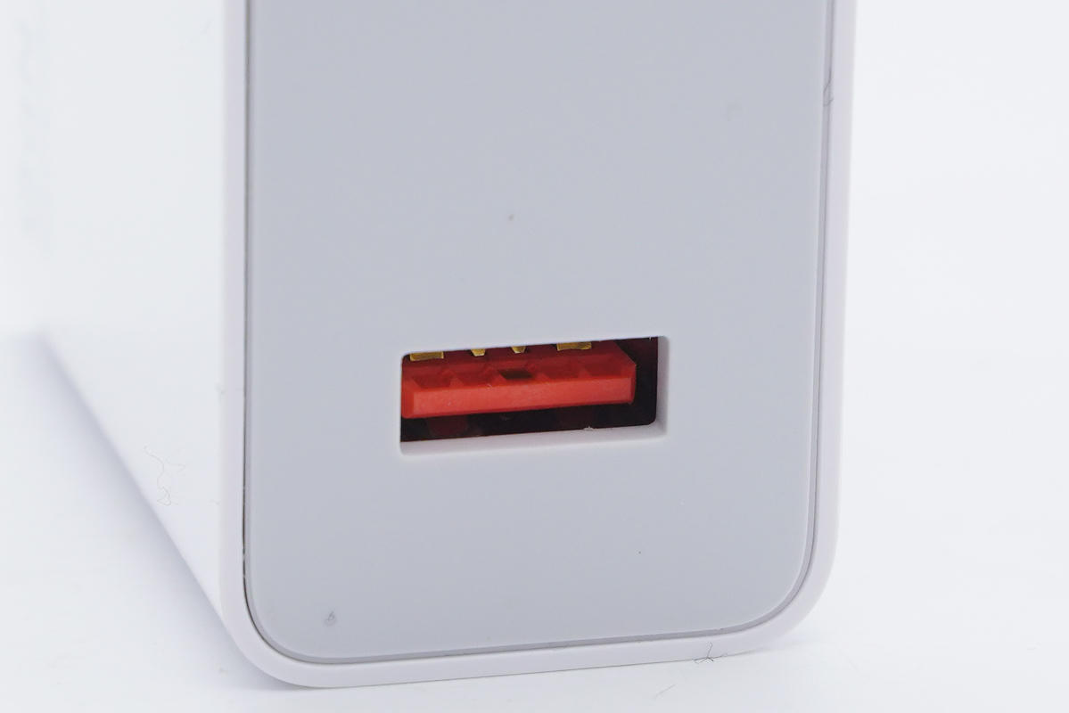 小米55W氮化镓充电器采用魔改USB-A口,橘红色舌片,前端设有特殊触点以实现PD输出,正负极弹片加宽以便过大电流。