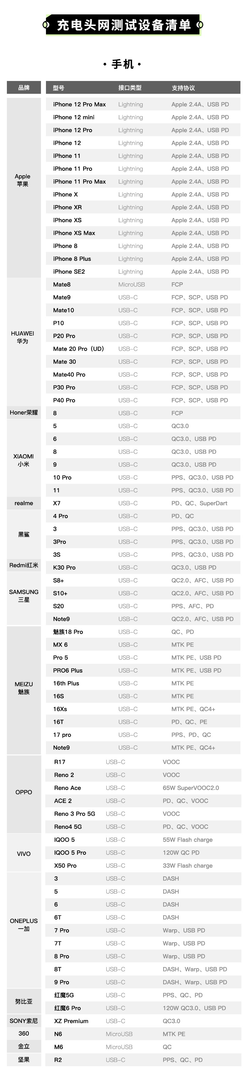 充电头网评测室目前现有手机75部,品牌包括苹果、华为、小米、realme、黑鲨、三星、魅族、OPPO、vivo、一加、努比亚等,以上机型基本已经覆盖手机端绝大部分的快充协议了,包括众多私有快充,都是可以实际测试得出结论。