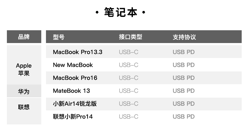 笔电端目前充电头网评测室共有6台笔记本电脑,分为苹果、华为、联想三个品牌,这些笔电都有一个共同点,均配备USB-C物理充电接口且支持USB PD快速充电,这里面充电功率最高的当初MacBook Pro 16了,支持百瓦快充功率,原装96W充电器也是苹果首款百瓦级别的USB PD大功率充电器。