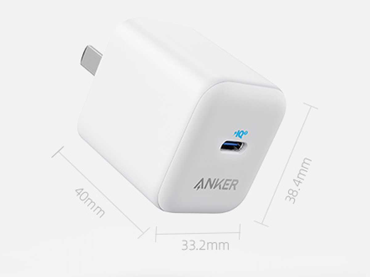 Anker 20W可折叠快充充电器三围尺寸分别是40mm X 33.2mm X 38.4mm,按照20W额定功率计算,功率密度为0.39W/cm³,重量为53.5g。