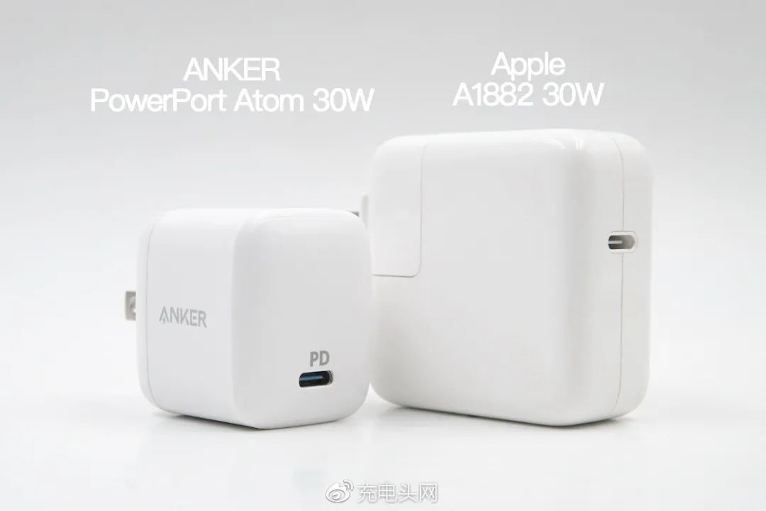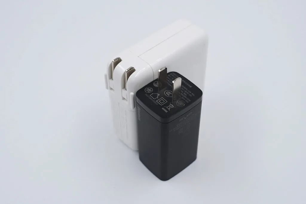 氮化镓元器件的使用,让充电器在体积与性能上可以同时兼顾,ANKER PowerPort Atom PD1 GaN充电器输出功率达到30W,APPLE USB-C充电器输出功率同样是30W,但体积上却是完全不同的级别,ANKER充电器不含插脚三围大小仅有353841mm,比苹果充电器体积小40%。