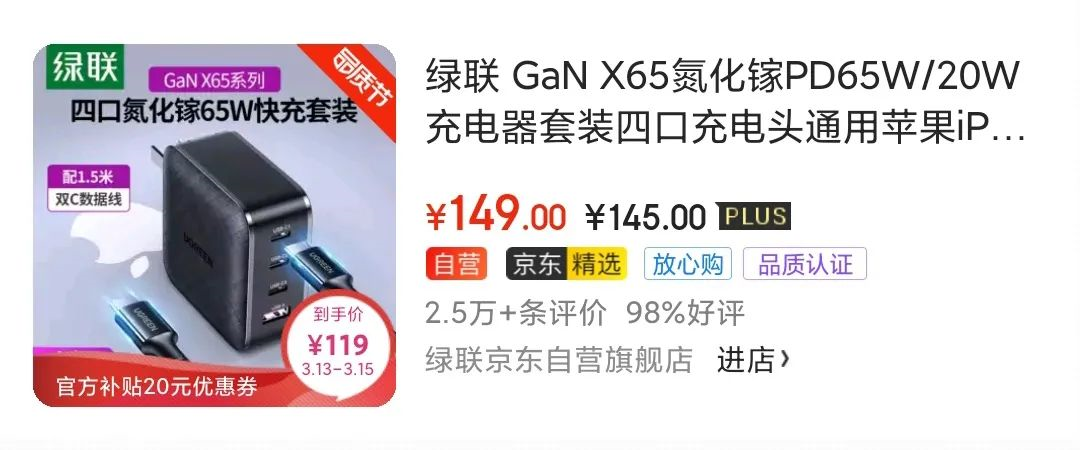 在京东APP内搜索品质认证关键词可以进入对应栏目,获得认证的商品会在介绍里出现紫色的品质认证LOGO,代表其经过了京东多项测试拥有更优品质保证。充电头网对京东充电配件类中的充电器类别进行盘点,选出了款获得京东品质认证的充电类产品,下面是他们的介绍。