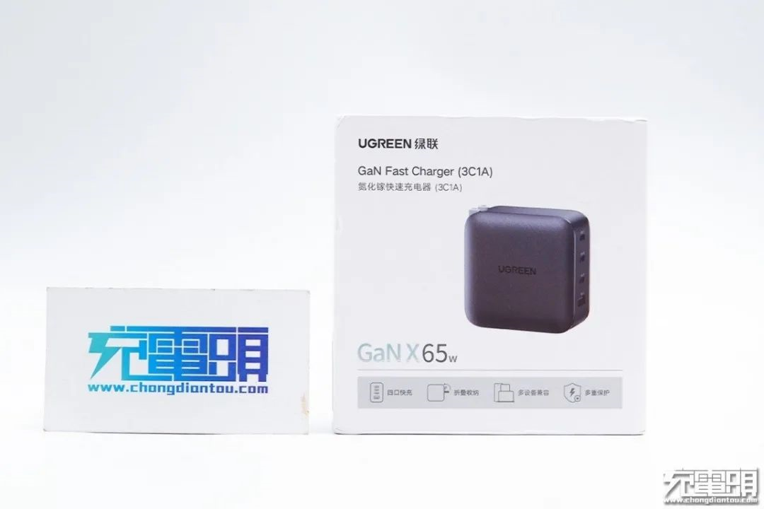 绿联3C1A氮化镓充电器从外观上来看属于方形结构,微鼓的两侧设计了条纹拉花增加握持摩擦力,中间亮面印刷着绿联商标“UGREEN”,整体看起来斯文低调。最大输出功率65W,接口配置共有四个输出口,是市面上少见的3C1A接口配置。