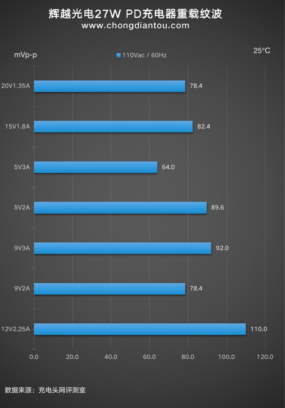 我们平时看充电器上面的参数输出100W或者65W是充电器可以为设备提供的最大输出功率,但充电器从插座上汲取的功率往往要更大一些,下面是辉越光电27W PD充电器在220V 50Hz和110V 60Hz交流输入的情况下分别进行了转换效率测试,测试结果如下: