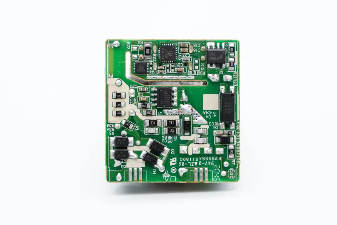 通过观察PCB背面,可以看到初次级之间电路开槽用来穿过隔离板,右上角是今天要介绍的重点,芯茂微LP15R060SD同步整流芯片。