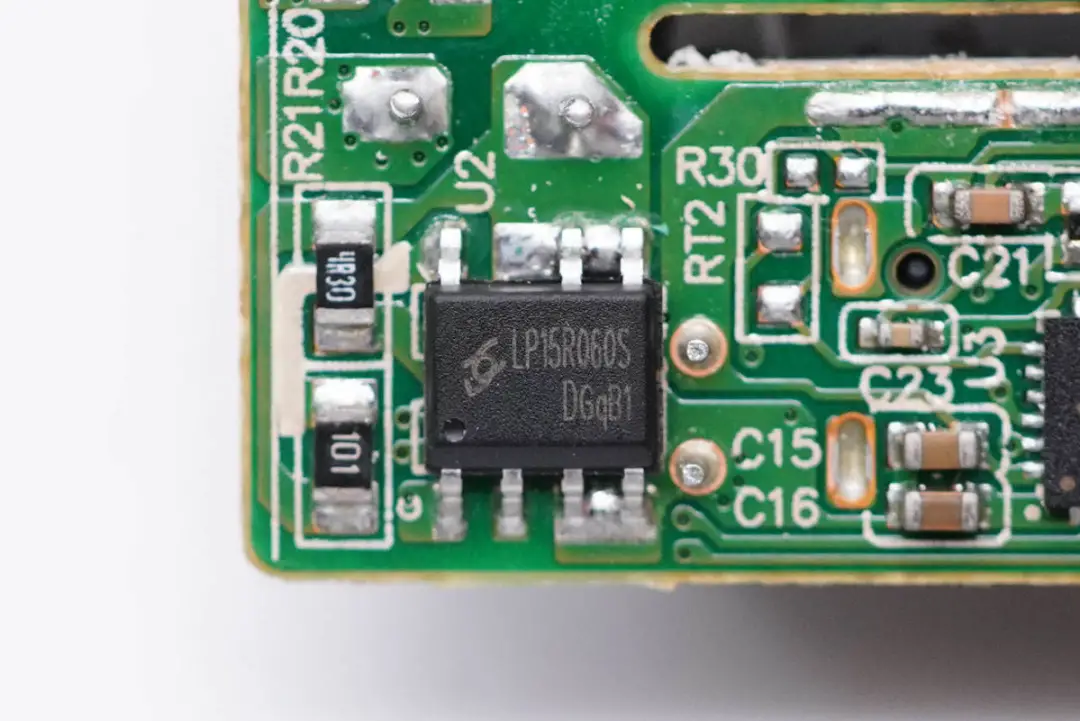 充电器采用芯茂微LP15R060SD来进行同步整流,LP15R060SD内部集成支持DCM和CCM的同步整流控制器和60V耐压12mΩ导阻的同步整流管,外围元件精简,引脚大面积敷铜辅助散热。