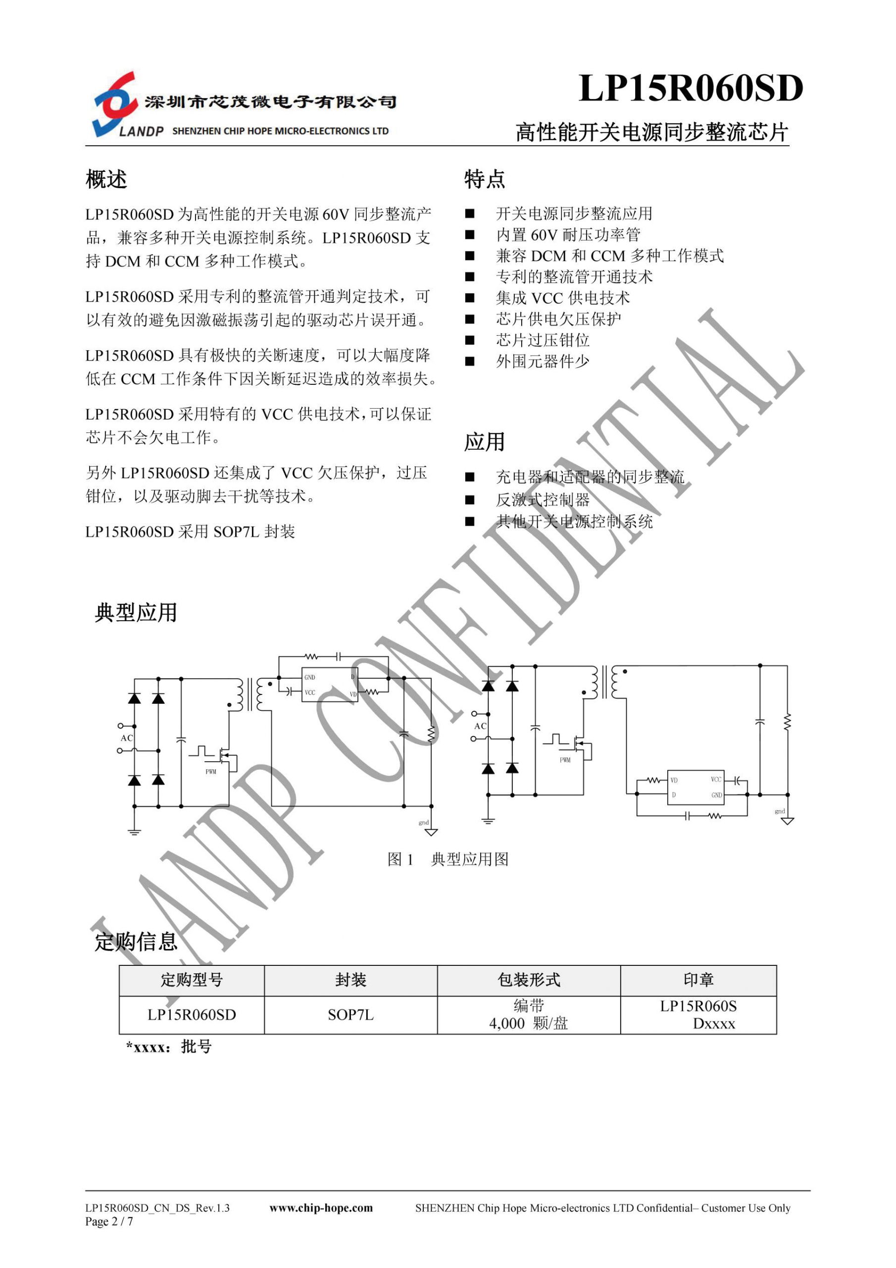 芯茂微LP15R060SD是一颗高性能开关电源同步整流芯片,耐压60V,兼容DCM和CCM工作模式,适用于开关电源同步整流应用。LP15R060SD采用芯茂微专利的同步整流管开通判定技术,可以有效避免同步整流误开通。LP15R060SD具有极快的关断速度,可以在CCM模式下大幅减小关断延迟造成的效率损失。同时还具有特有的VCC供电技术,并且还集成了VCC欠压保护和过压钳位,确保芯片稳定工作。