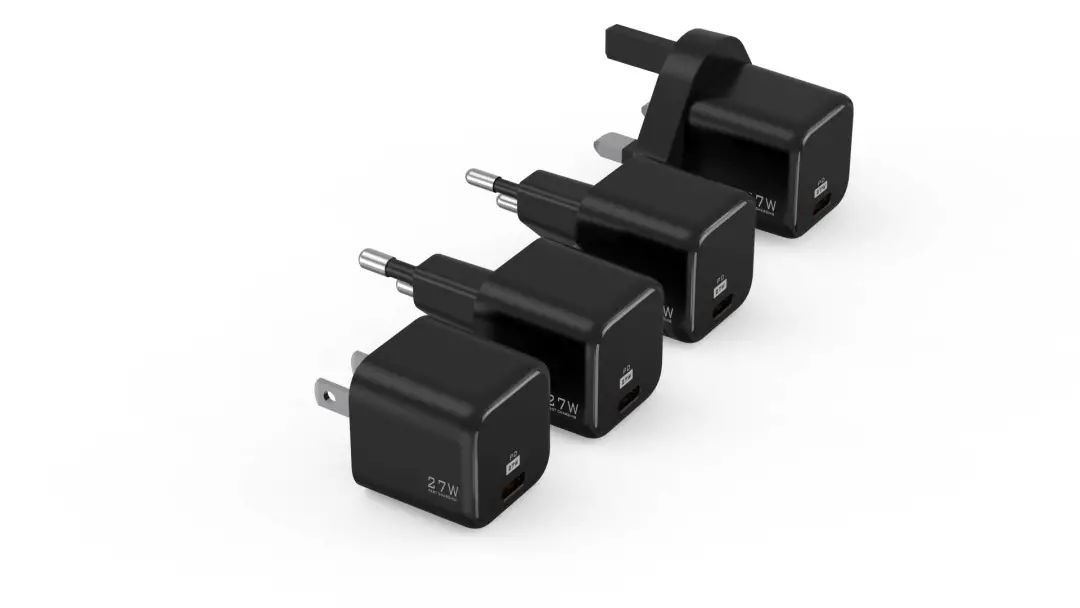 辉越光电27W快充充电器有单USB-C口和1A1C两种规格,并且有磨砂白、磨砂黑、半纹半光白、半纹半光黑等多种配色,插脚规格可分为有中规、美规、日规、台湾、韩规、欧规、英规等。