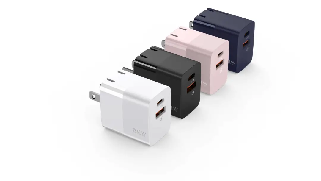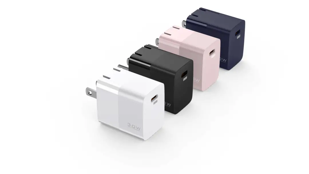 辉越光电推出的1A1C接口折叠插脚30W PD快充,型号为BP-PD301U1C,具有白色和黑色两种配色,并配以半磨砂半光面的外观设计。长43mm,宽39mm,厚28mm。
