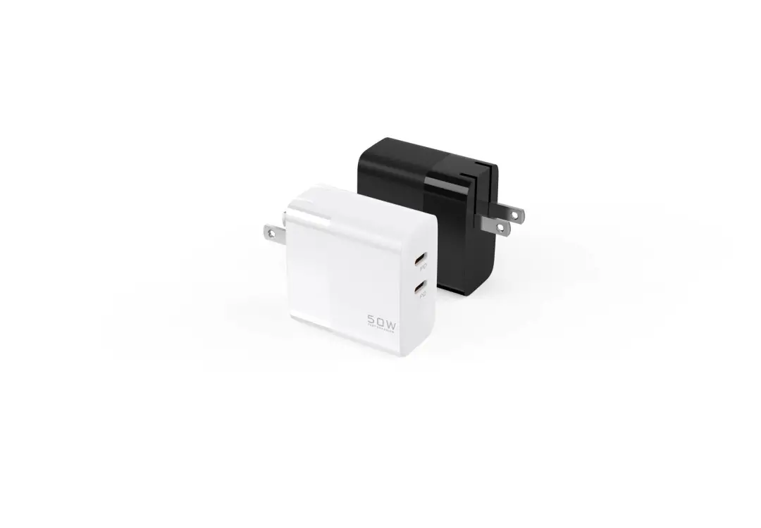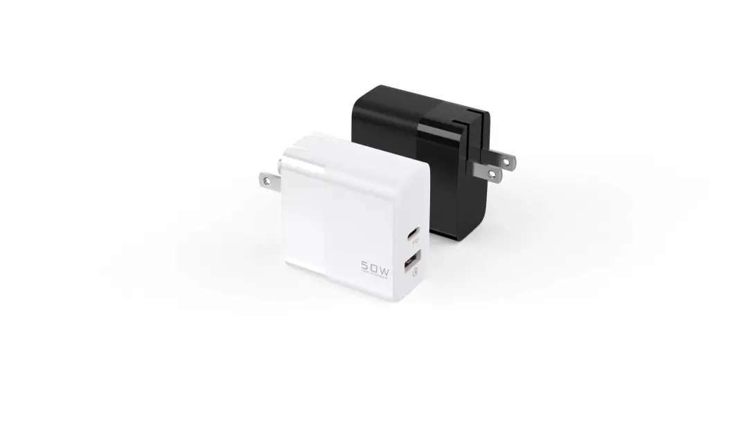 辉越光电推出的1A1C接口折叠插脚50W PD快充,型号为BP-PD501U1C,具有白色和黑色两种配色,并配以半磨砂半光面的外观设计,长53mm,宽53mm,厚28mm。
