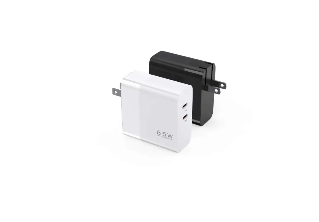 辉越光电65W充电器还有双USB-C接口版本,两个接口均支持最大65W输出功率,在双口同时工作时,USB-C口最大输出45W,可用于笔记本电脑充电,USB-C2接口支持最大20W,可用于iPhone 12等手机快充,双口快充提升用户使用体验。