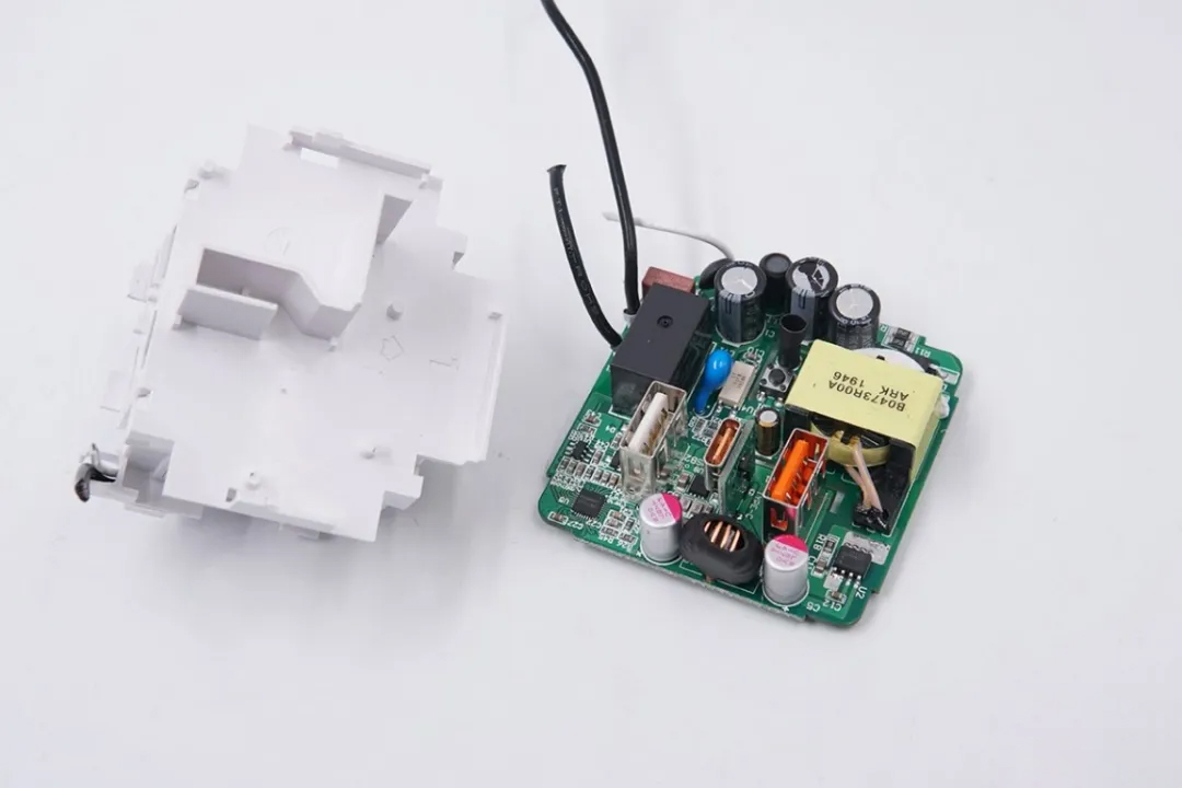 充电器开关电源宽范围输出,同步整流芯片采用瑞之辰RZC3618CS,采用永阜康NS6322进行二次降压为USB-A口输出5V恒压,采用云矽半导体XPD636协议芯片控制USB-C口输出。整个充电器模块也非常小,进而保证了整个插座虽为二合一设计,但仍保持和传统插座一样的造型大小,不会影响房子装修体验。
