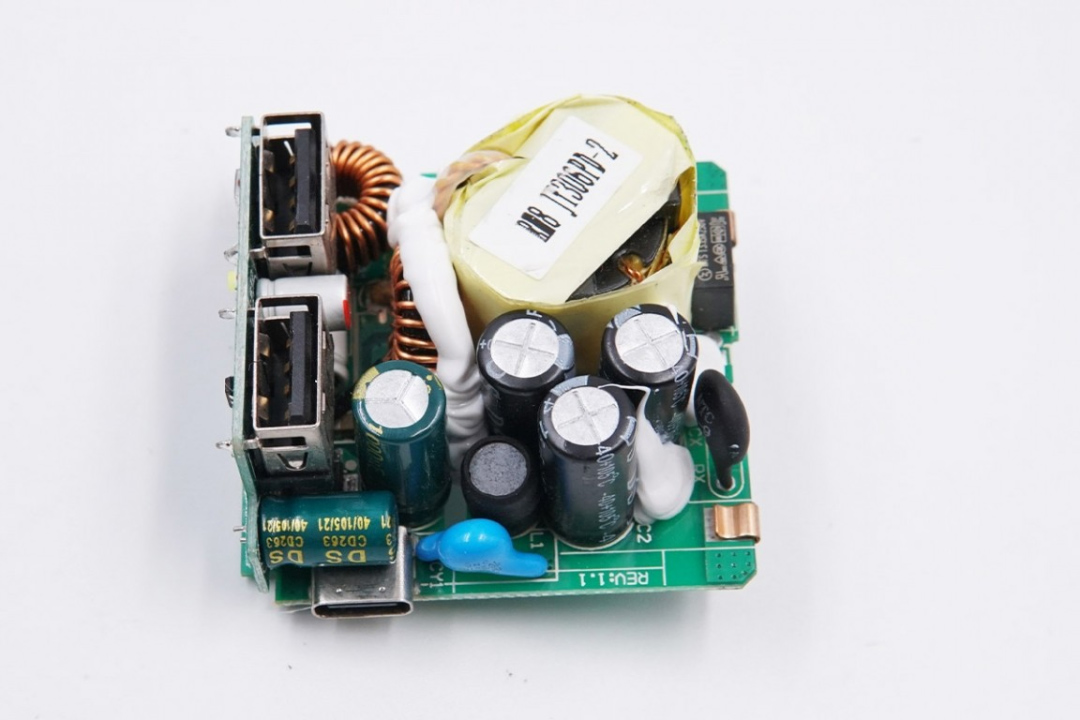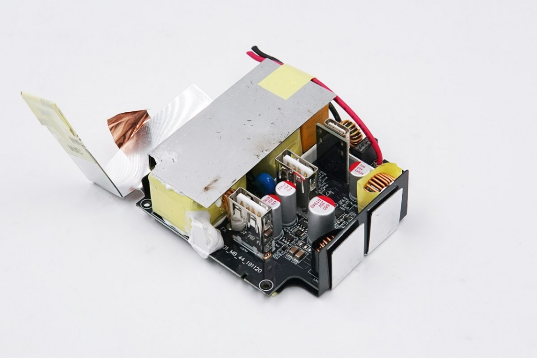 充电输入输出端采用永铭和绿宝石电容进行滤波,变压器和氮化镓芯片配有黄铜散热片散热,输出端设有二次降压小板充分利用内部空间,产品整体用料做工讲究。