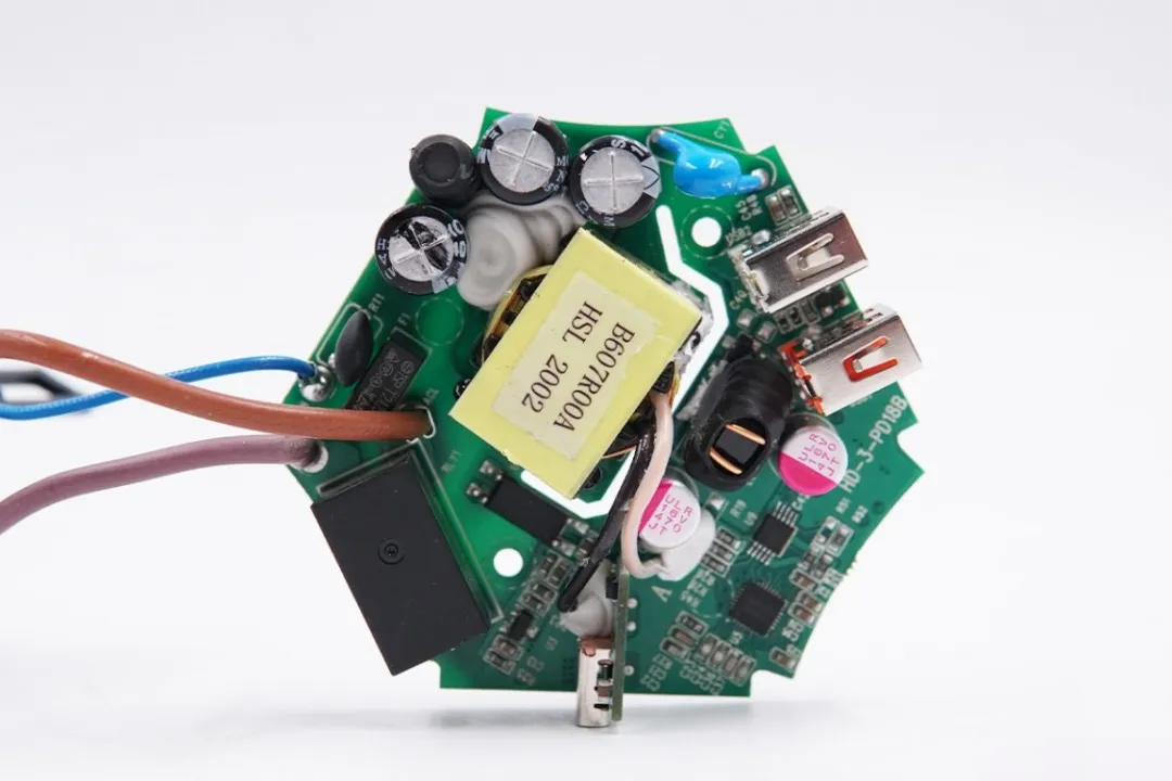 USB-A电路则采用芯朋微PN8370+PN8306方案,固定5V电压输出。得益于两套高集成方案的使用以及合理的布局,即使是集成了三路电路,电路板看上去仍十分简洁。