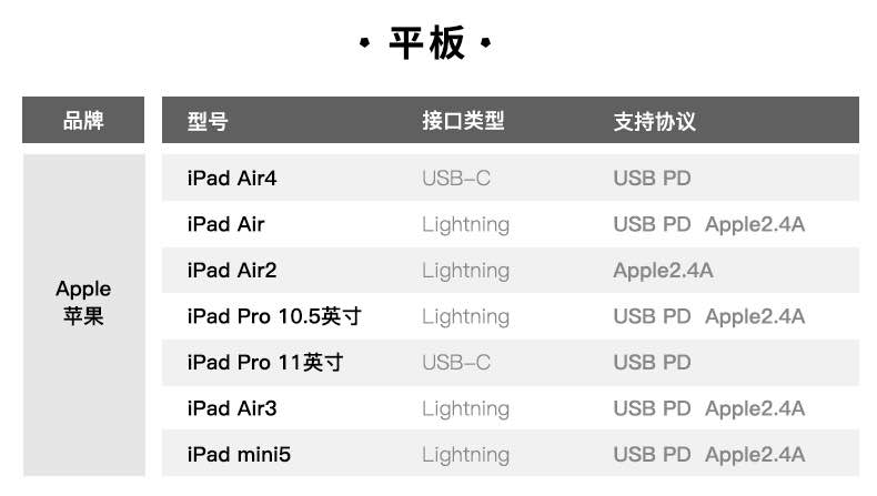 平板这里,目前充电头网评测室的平板电脑型号以iPad为主,涵盖了目前苹果三条iPad产品线,具体包括iPad mini 5、iPad Air第一代到第四代、iPad Pro 10.5英寸到11英寸(全面屏)的机型,充电接口也覆盖Lightning和USB-C。